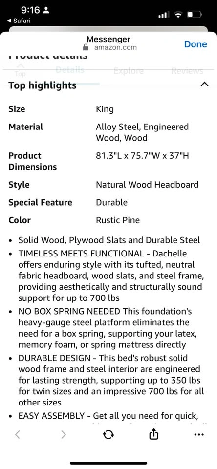 Selling a king wood frame bed and Lull memory foam king mattress as a set for $700. Both are in excellent condition. The mattress is 10" thick. The bed frame is a rustic pine with headboard, solid wood foundation with wood slats support, so no box spring is needed. Dimensions are 81.3" L x 75.7"W x 37" H.