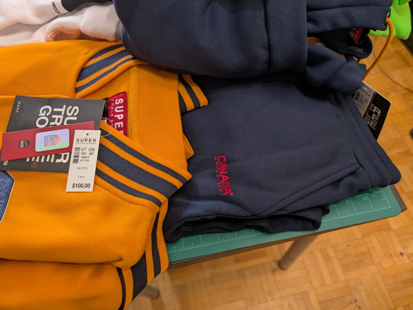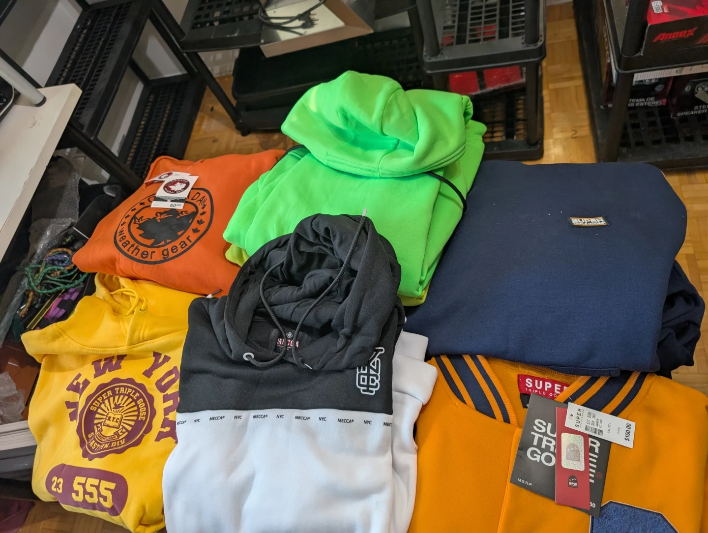 I have a variety of hoodies and sweaters available. There's an orange 'Weather Gear' hoodie, a green hoodie, a navy blue sweater with a small logo, a yellow 'Super Triple Goose' hoodie, and a black and white 'Mecca NYC' hoodie. Lastly, there is a 'Super Triple Goose' varsity jacket that was originally $100. All brand new.