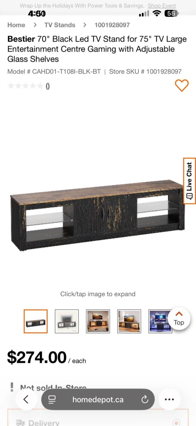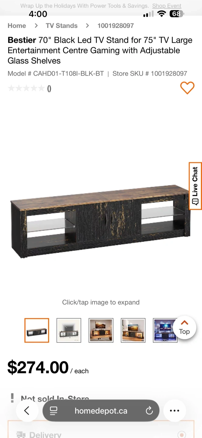 Selling a brand new, in-box Bestier 70" Black Led TV Stand for up to a 75" TV. It features a large entertainment centre with adjustable glass shelves. The model number is CAHD01-T108I-BLK-BT. Originally bought for $274