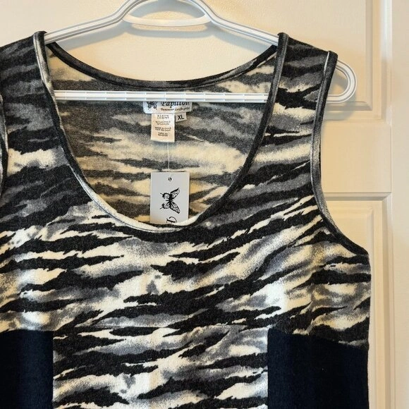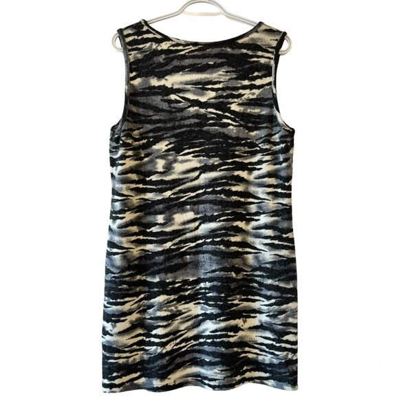 New with tags Papillon sweater dress in a soft, stretchy knit perfect for fall and winter. Features an abstract tiger-stripe pattern in black, white, and grey with contrasting black side panels for a flattering, modern look. Wear as a dress or layered tunic with leggings and boots.