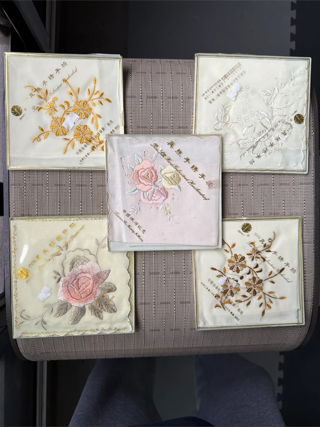Selling a set of silk handkerchiefs, each with a unique hand-drawn design. These are a beautiful and delicate accessory, perfect for adding a touch of elegance to any outfit. They come in their original boxes, making them ideal for gifting as well!