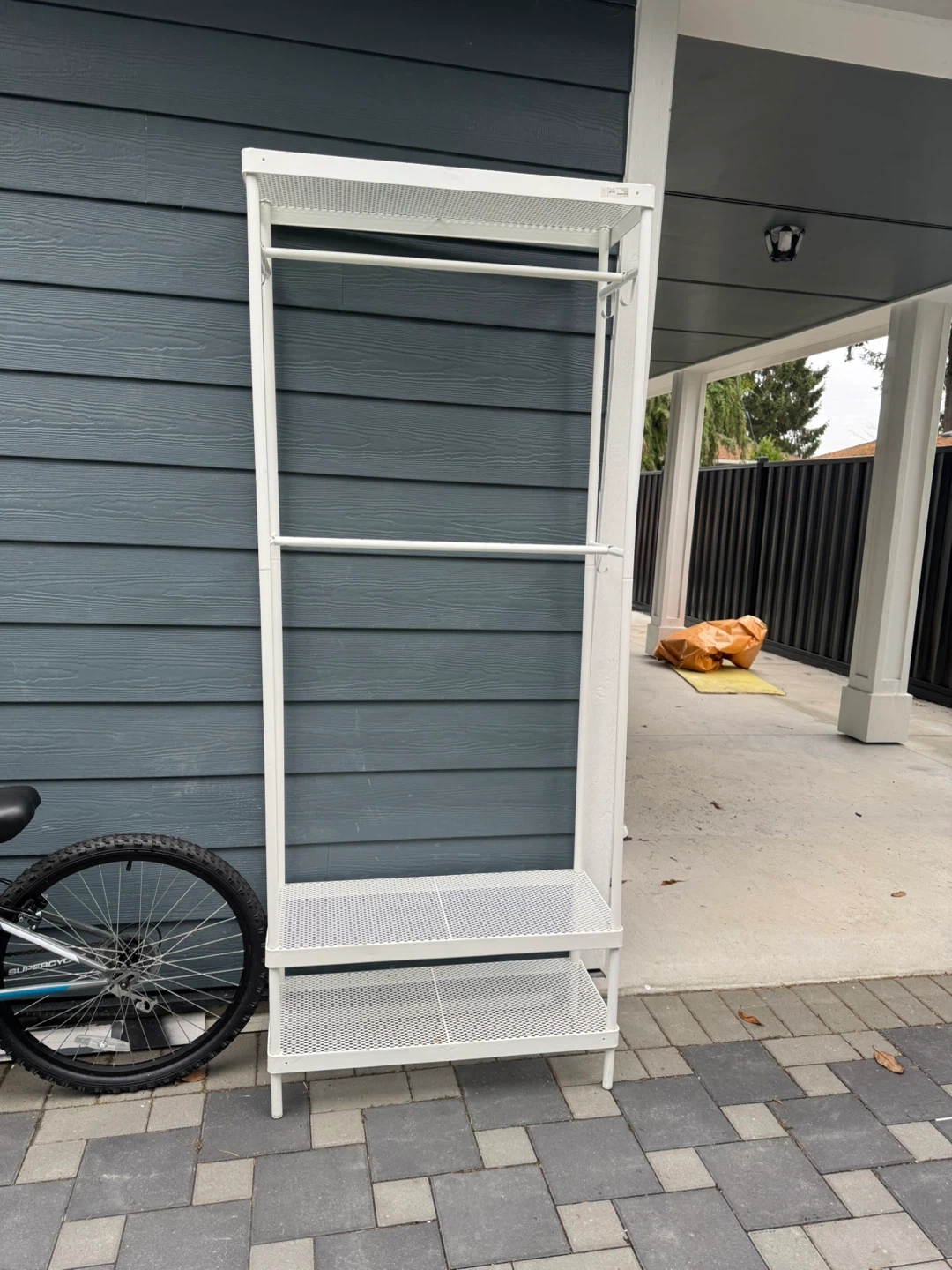 Selling a clothes rack in great condition! It's perfect for organizing your clothes and adding extra storage space to your room. It features a top shelf, hanging rod, and two lower shelves for shoes or other items.