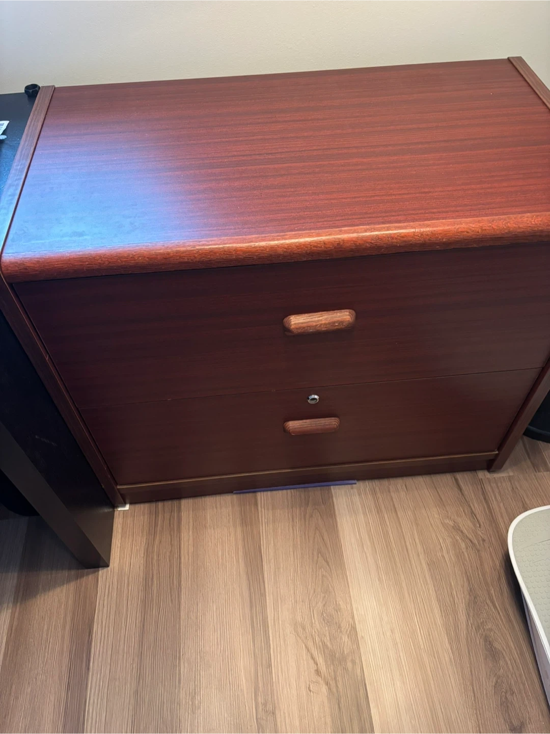 Here's a wooden two-drawer filing cabinet. It's a nice, sturdy piece of furniture for your home office or workspace. It has a classic look and the drawers slide smoothly. Perfect for keeping your documents organized!