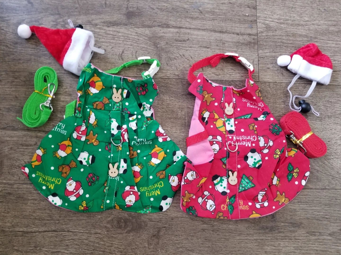 Two adorable Christmas-themed pet harnesses, perfect for the holiday season! Each harness comes with a matching leash and a cute little Santa hat. One is green and the other is red, both with festive patterns. Get your furry friend ready for Christmas! Brand new