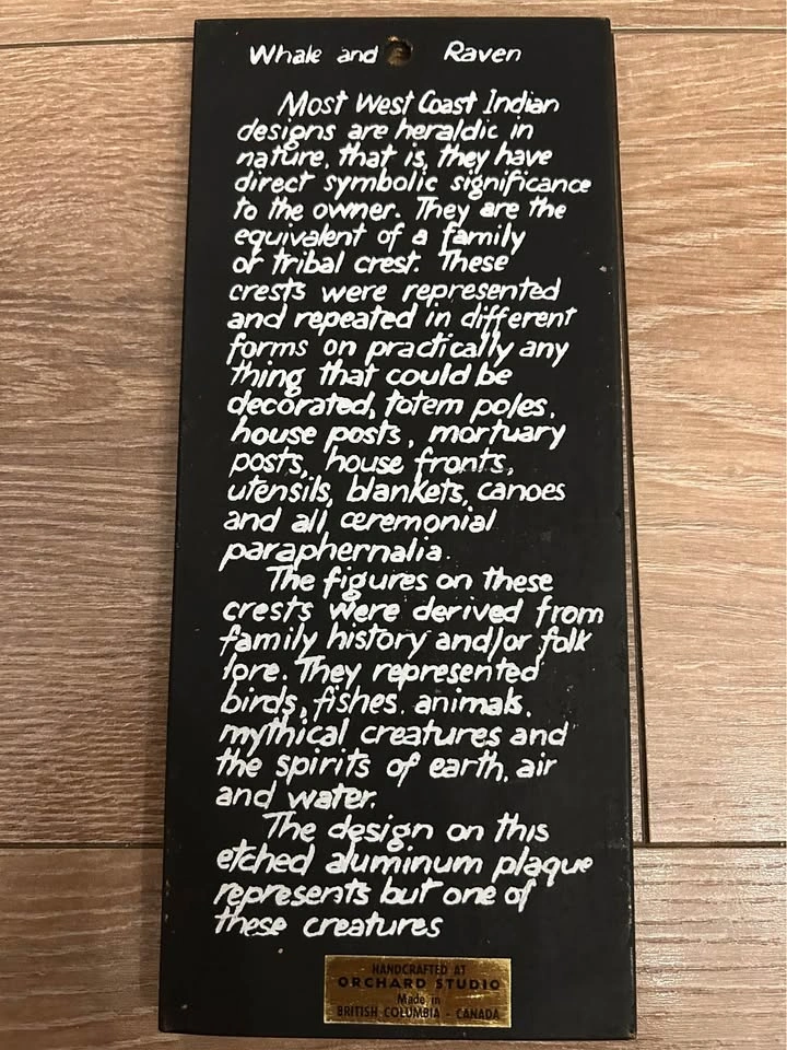 Vintage handcrafted etched aluminum plaque titled “Whale and Raven,” made at Orchard Studio in British Columbia, Canada.