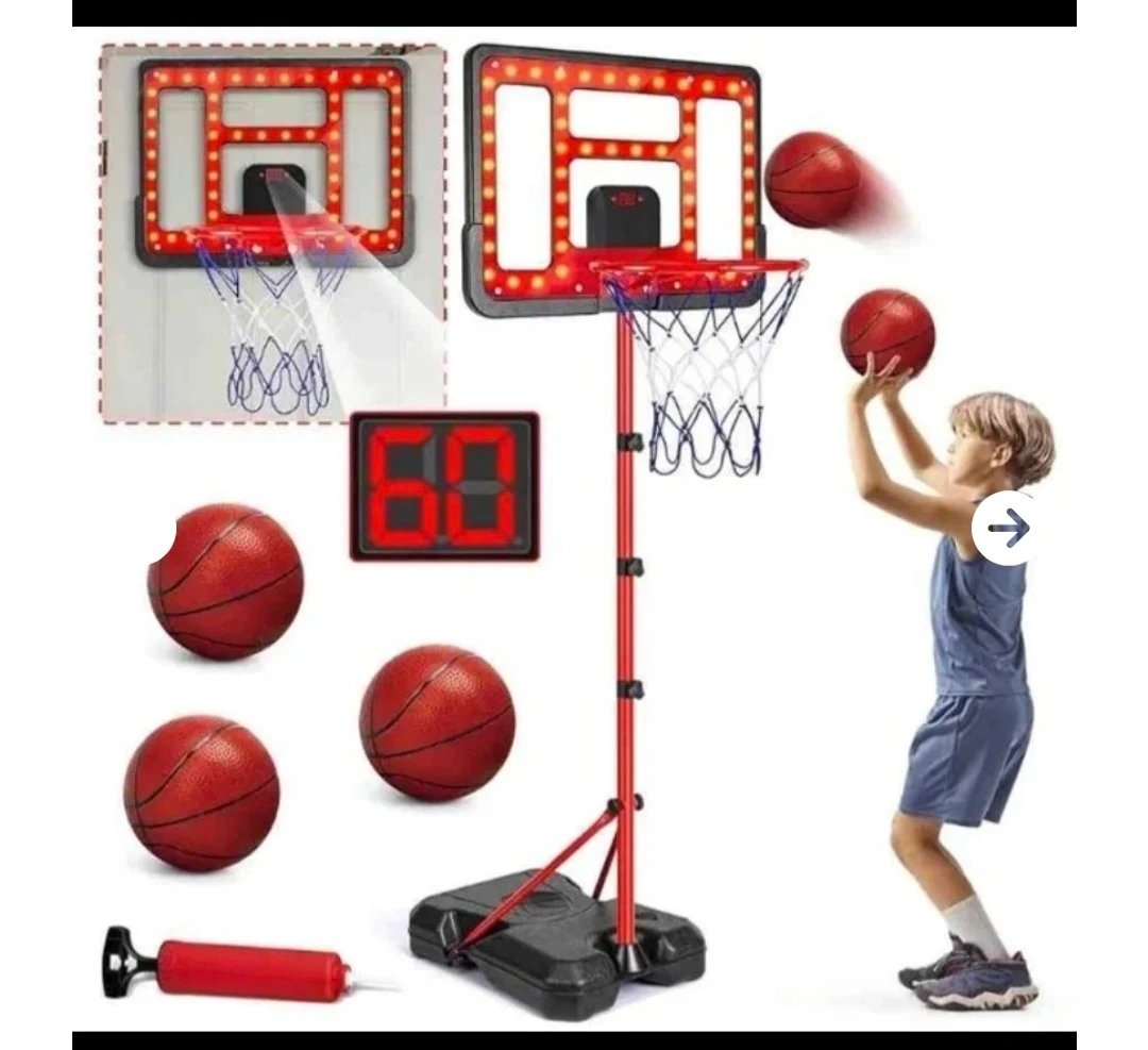 - This adjustable kids basketball hoop is perfect for young players who love to shoot and score. With a height range from 3.5 to 6.2 feet, it grows with your child and can be used both indoors and outdoors for endless fun. The hoop features a built-in LED scoreboard that lights up and counts each basket, making the game even more exciting and interactive. Made with a sturdy base and durable materials, it stays stable during play and is easy to move thanks to its portable design. Ideal for boys and girls ages 3 to 8, this basketball set helps develop coordination, confidence, and a love for sports. A great gift for birthdays, holidays, or active family playtime.