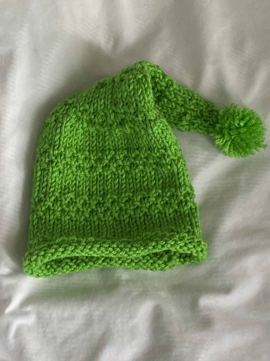 A cute, hand-knitted green baby hat with a little pompom at the end. Perfect to keep your little one warm and cozy!