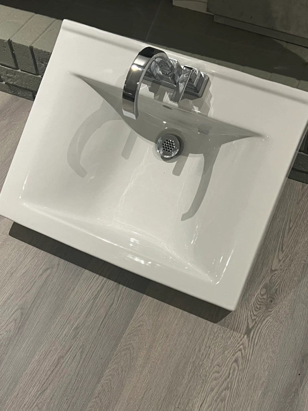 This rectangular white bathroom sink & modern chrome faucet is in great condition and ready to be installed in your bathroom. It can be installed as a vessel type sink on an existing counter or on top of a vanity cabinet.