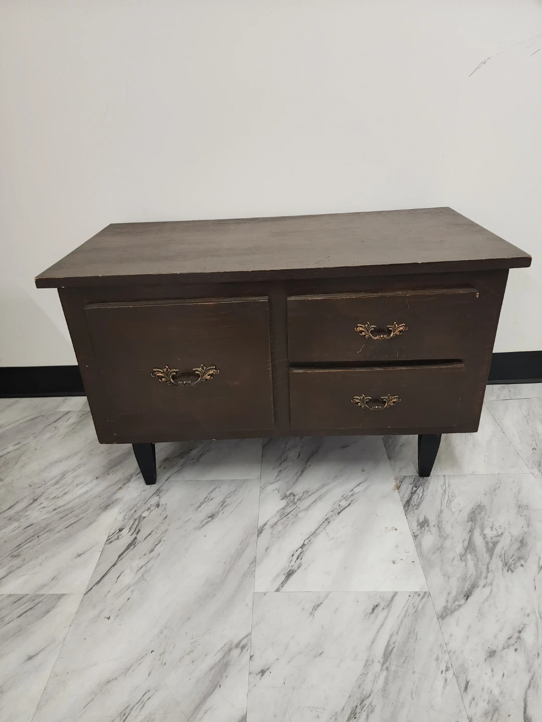 Selling a brown wooden storage chest. It has a hinged top and two drawers, perfect for storing blankets, toys, or other household items. It would be a great addition to any room!