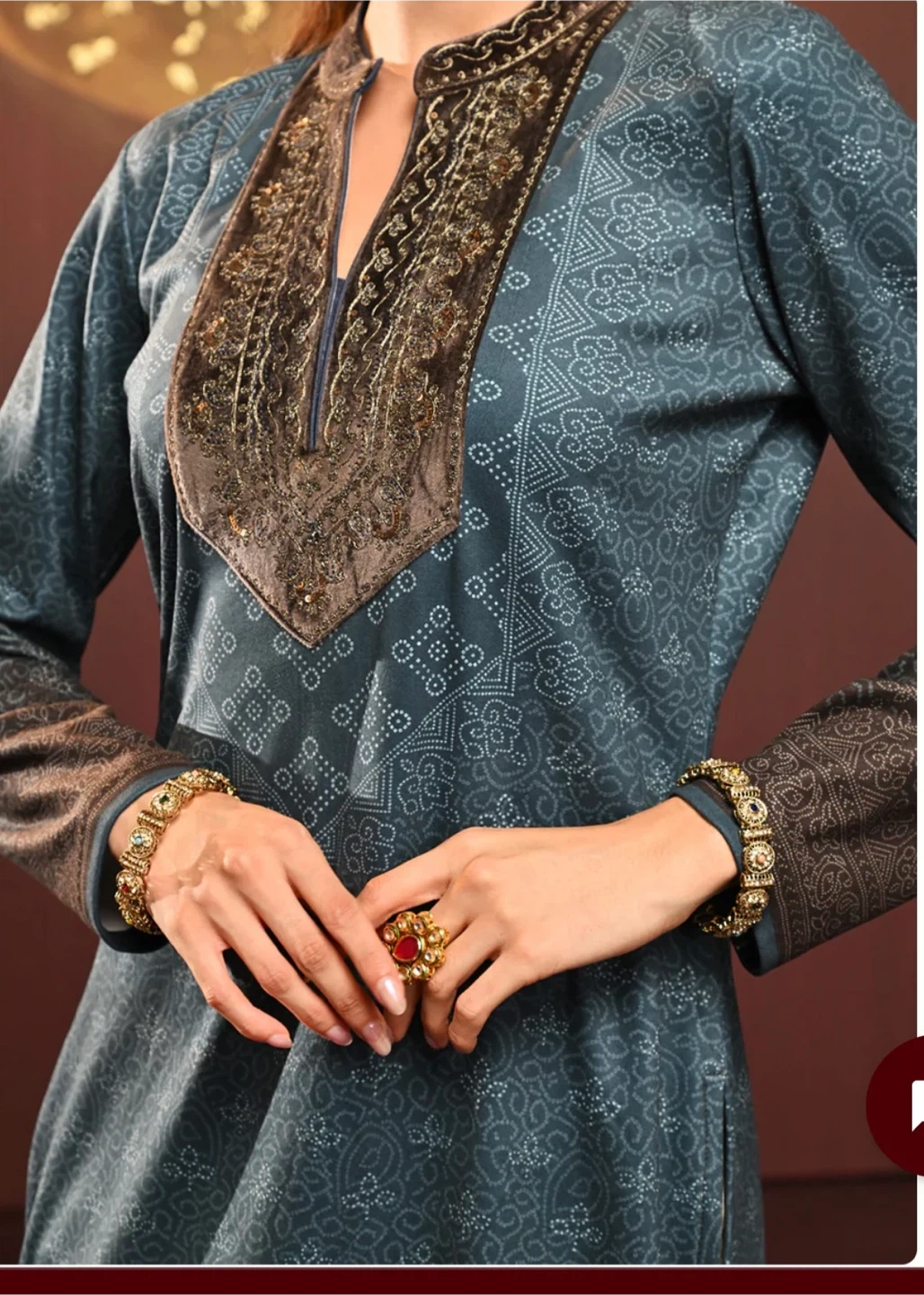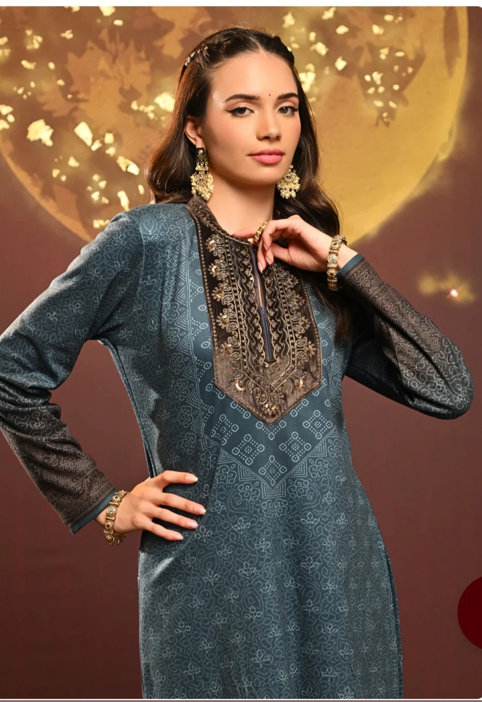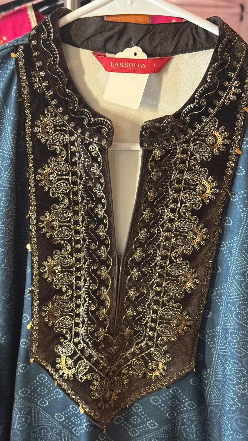This is a Lakshita Kurti in size L. It features a beautiful design on the neckline and a long, flowing style. It's perfect for any occasion!