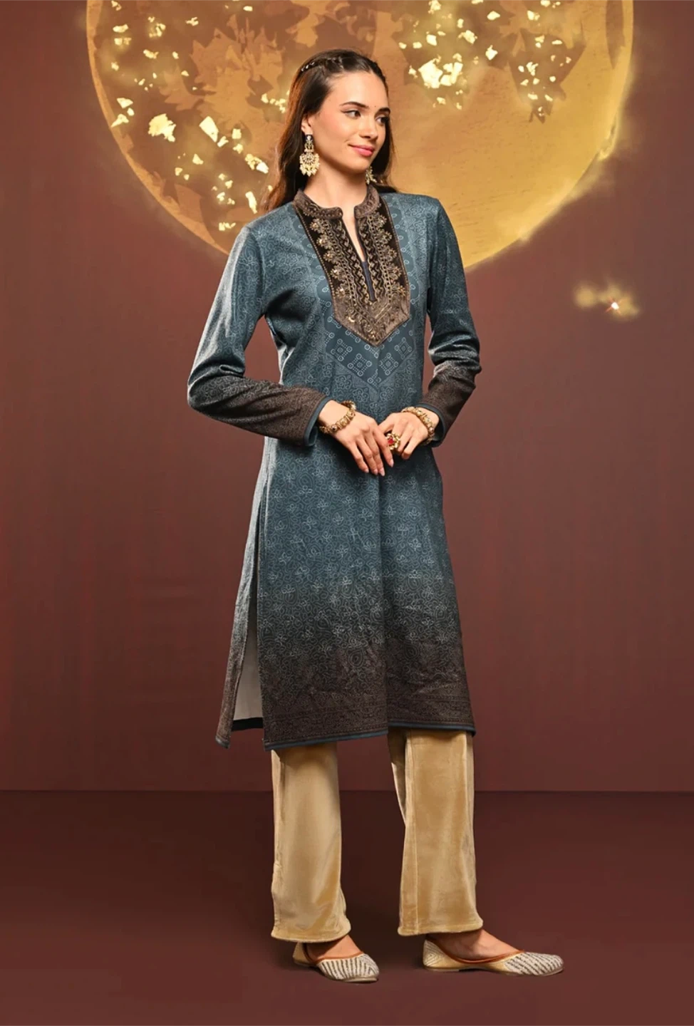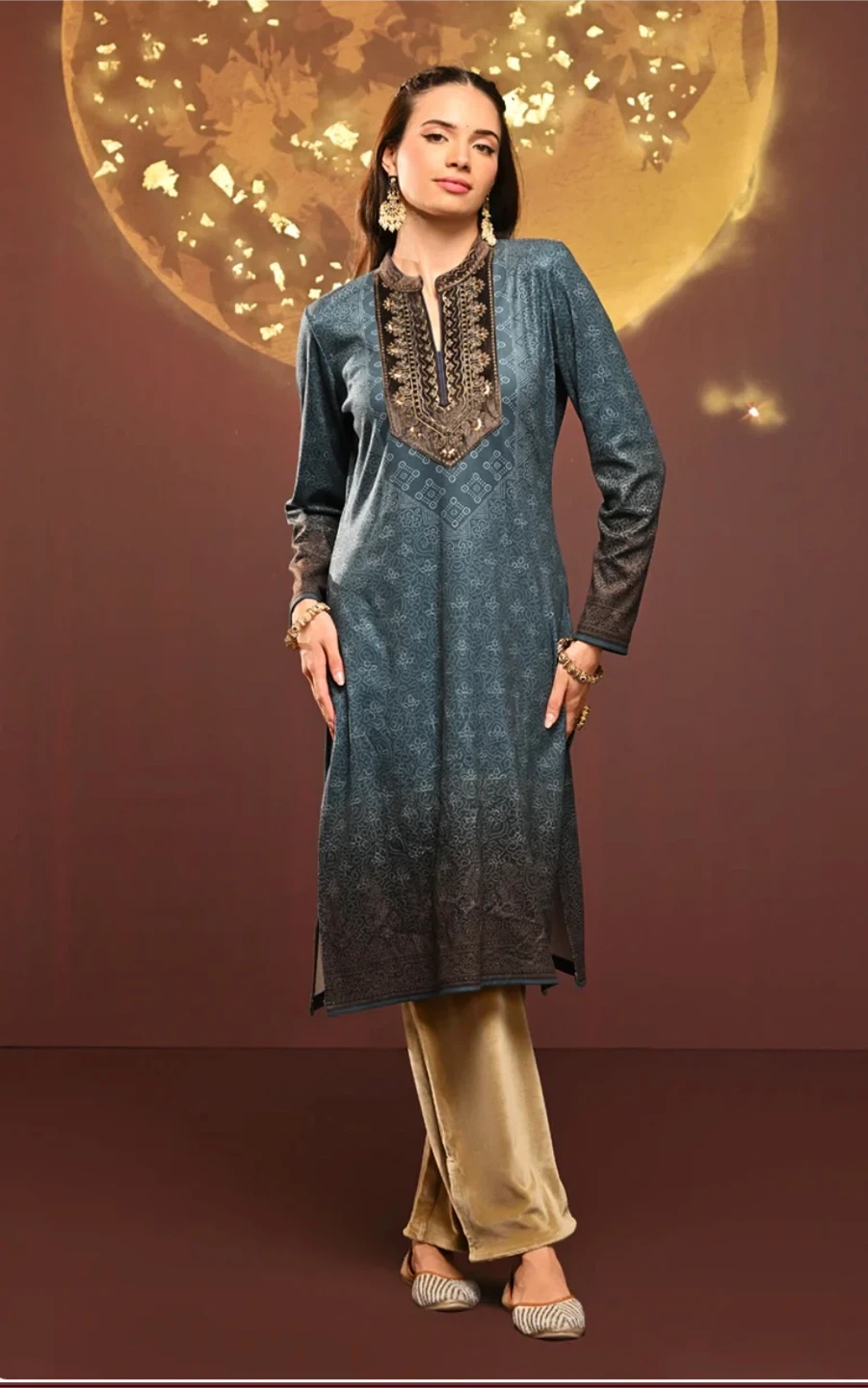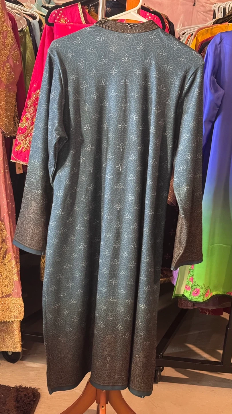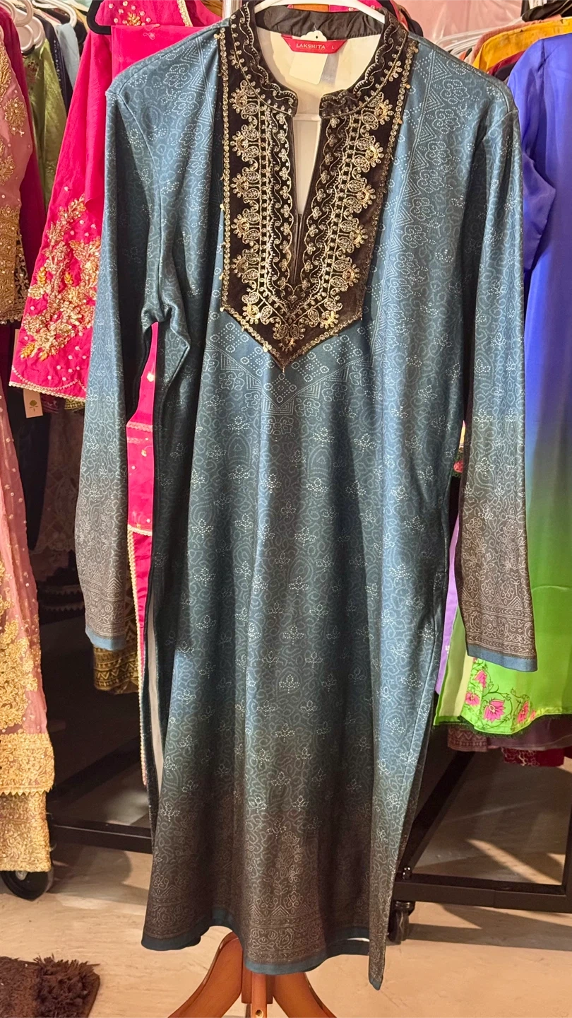 This is a Lakshita Kurti in size L. It features a beautiful design on the neckline and a long, flowing style. It's perfect for any occasion!