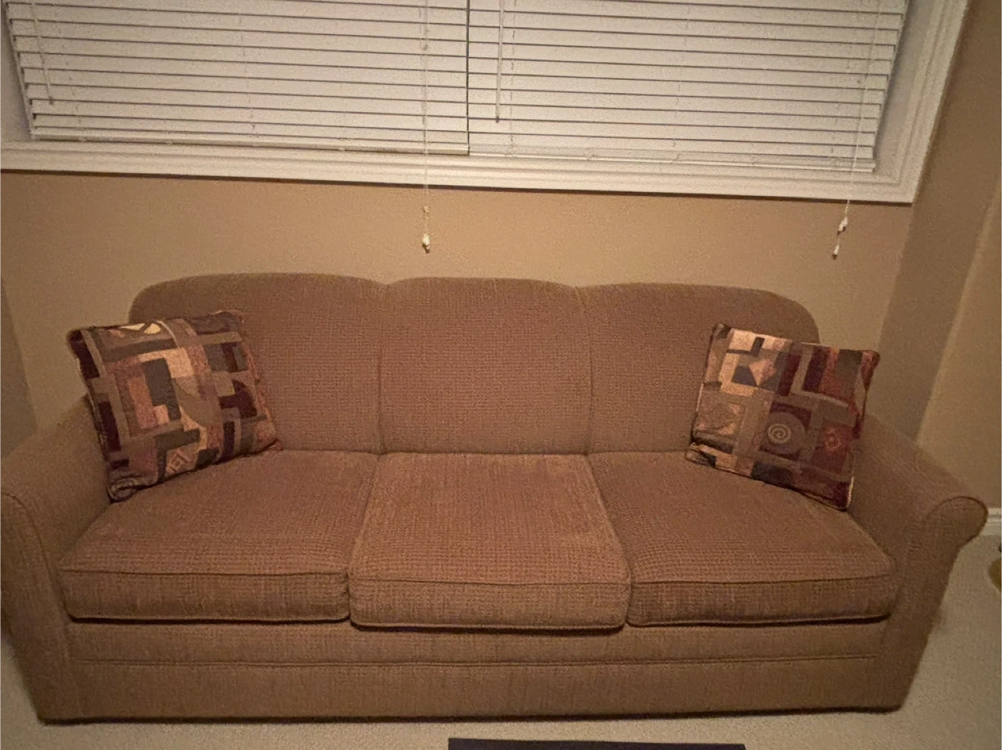 Selling a brown pull-out sofa bed in very good condition. It's a comfortable couch that easily converts into a bed for guests or extra sleeping space. It has a neutral colour that will match any decor. Perfect for a living room or guest room