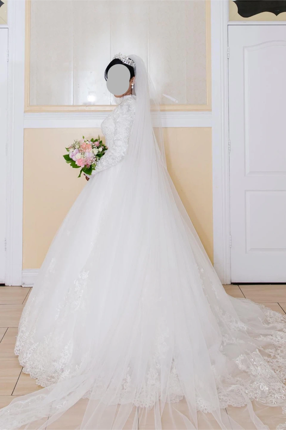 Selling a beautiful white wedding dress. It's in great condition and ready for its next special day! The dress features long sleeves and delicate lace detailing.
