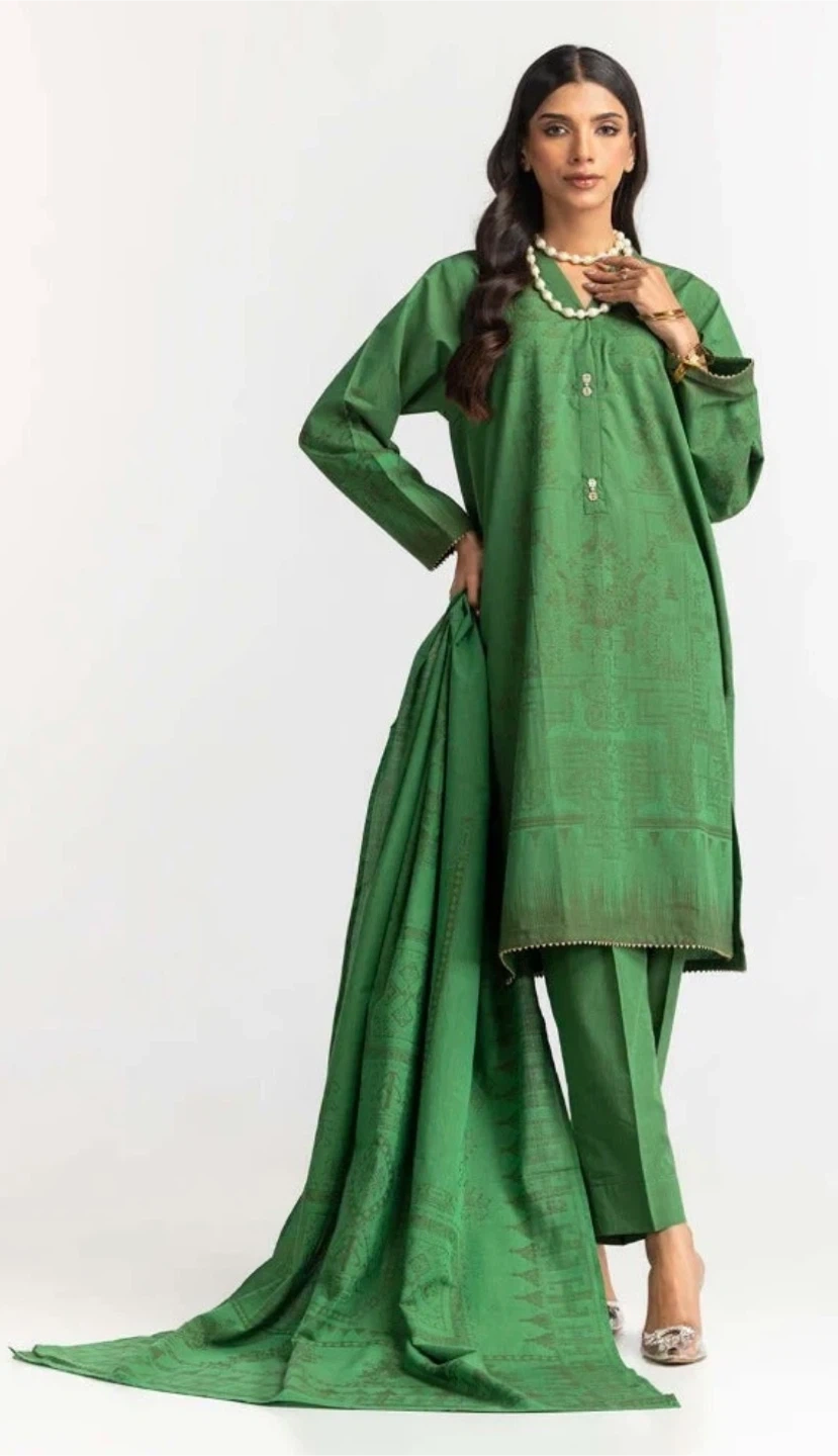 Green Shalwar Kameez three piece jacquard suit