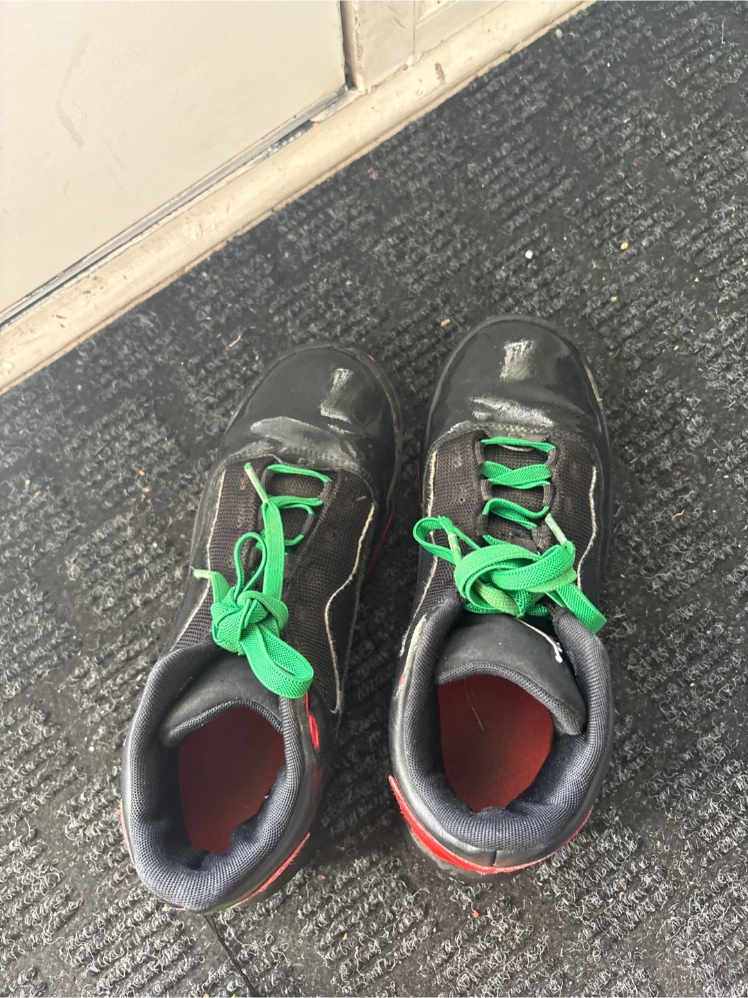 Selling a pair of Jordan basketball shoes in black and red. They have green laces and the Jordan logo on the side. Good condition, ready for the court!