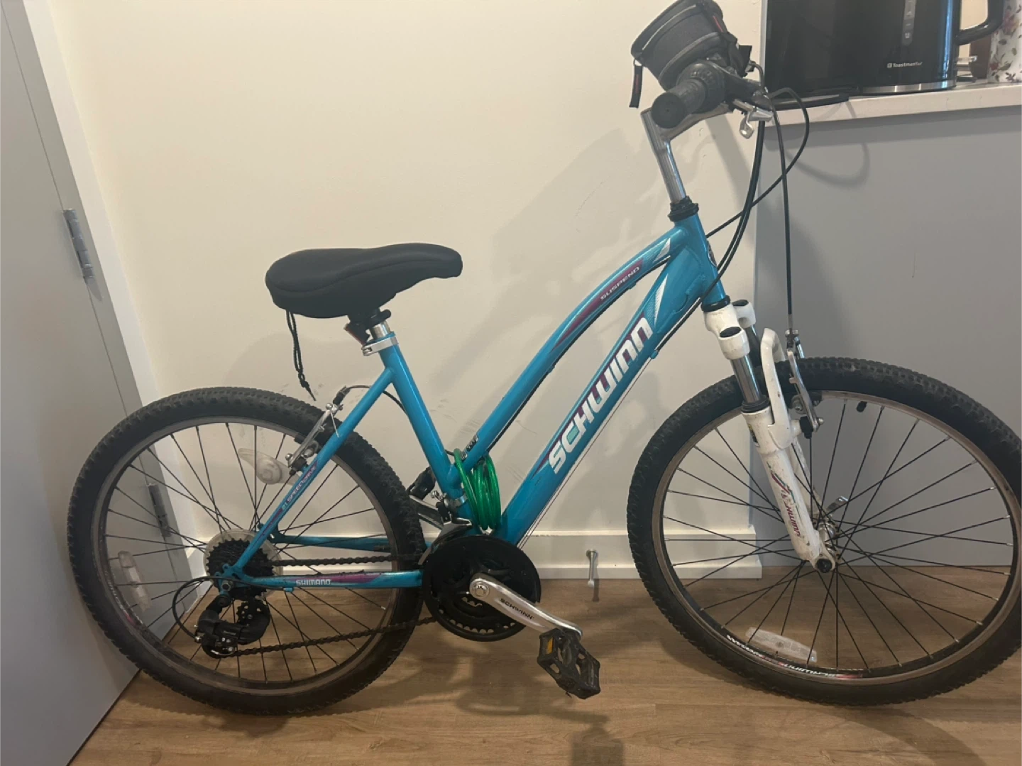 Selling a Schwinn women's mountain bike in a lovely teal colour! It's got a comfy seat cover and is ready for some trails or city cruising