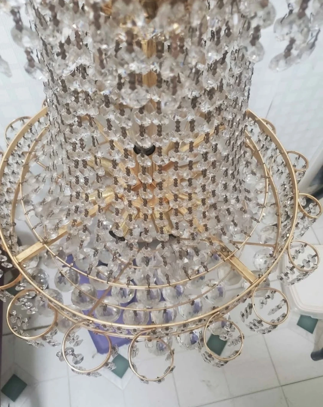 Measures 20 inches wide and 26 inches height. Made with quality expensive crystals!! Has 5 rows of around 50 large crystal balls on the bottom. Very nice!! Works great. Its expensive. paid $1500 .. selling for only $250 Great price. Final price .Cash.
