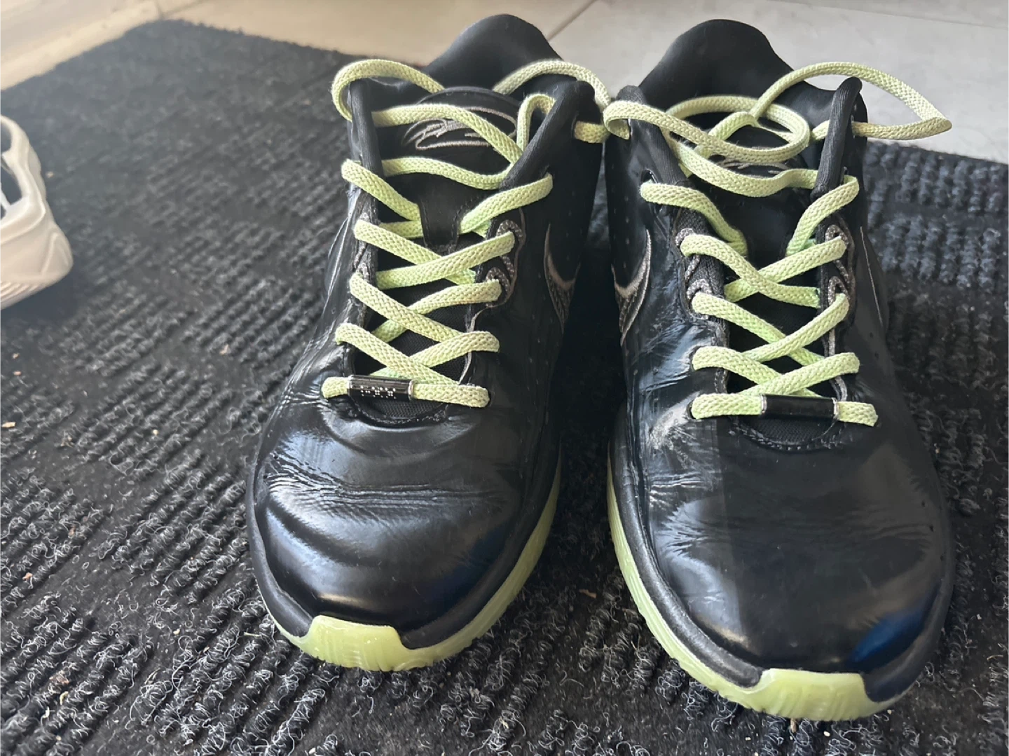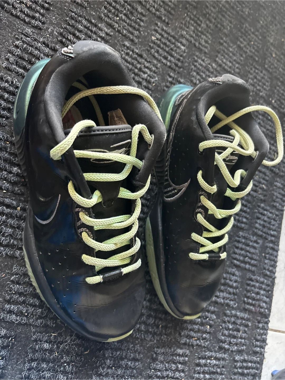 Selling a pair of Nike Zoom LeBron III shoes in black with lime green accents! These shoes are in used condition, as you can see in the pictures, but still have lots of life left. They feature a unique design on the back and are perfect for basketball or casual wear