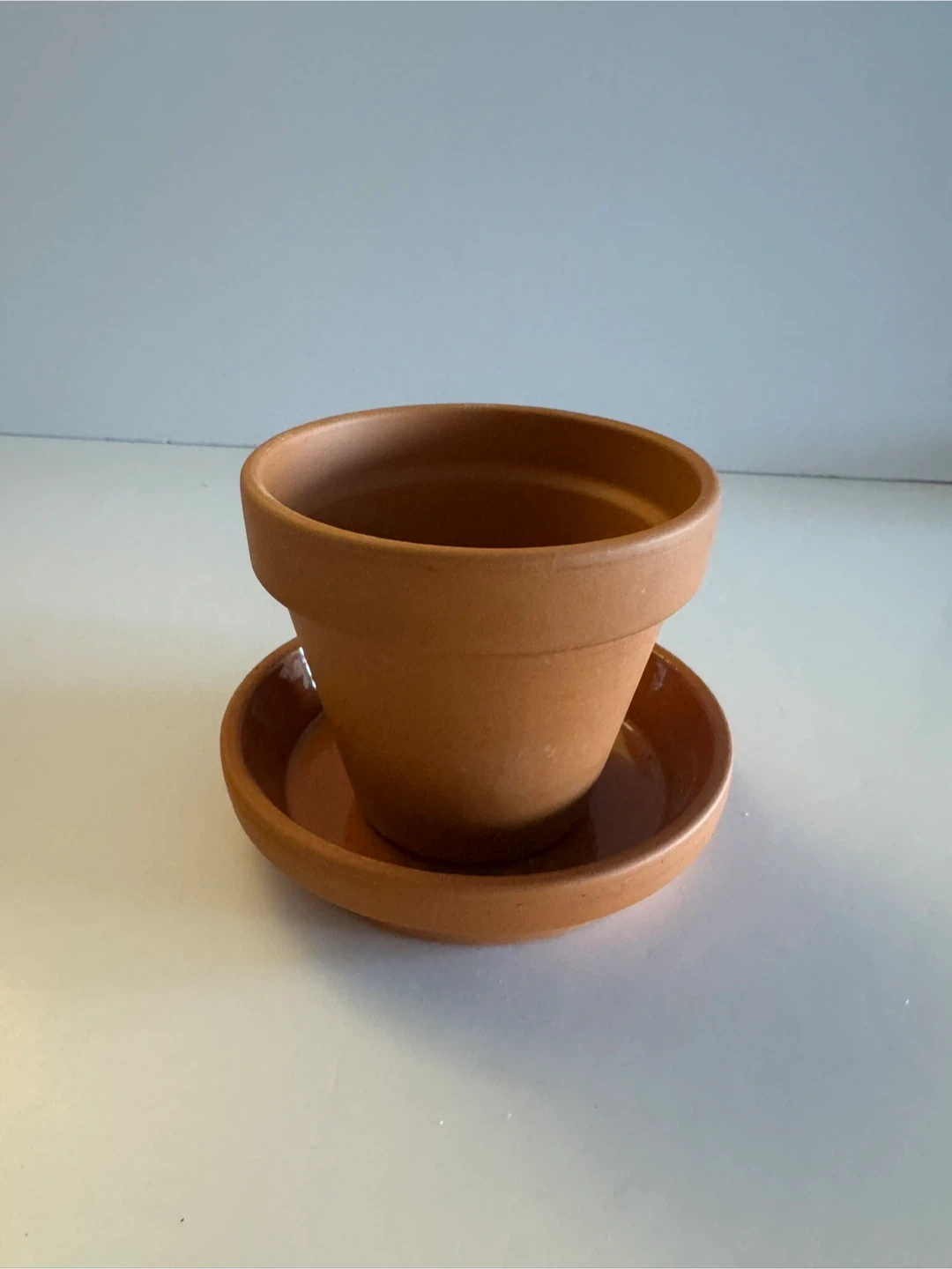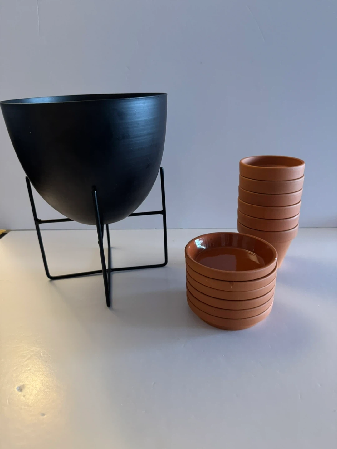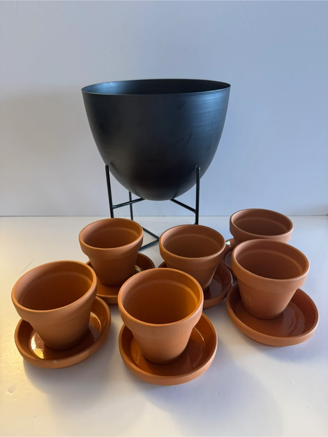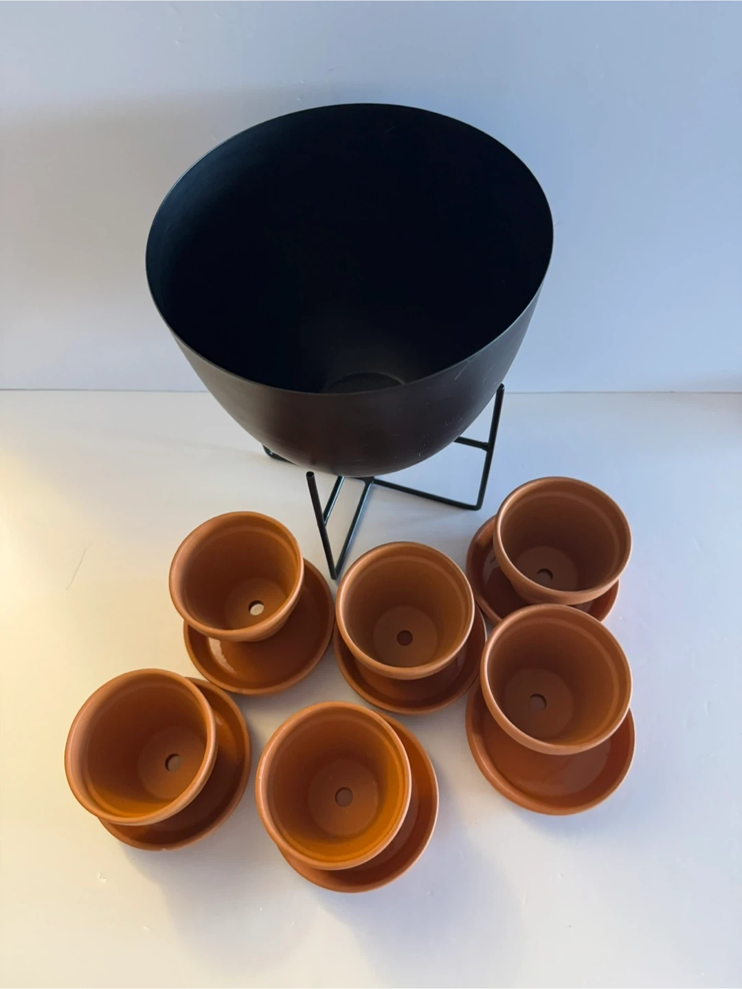 Selling a set of small terracotta plant pots with saucers and a black metal plant stand. The pots are perfect for starting seedlings or housing small plants. The stand adds a modern touch to any room