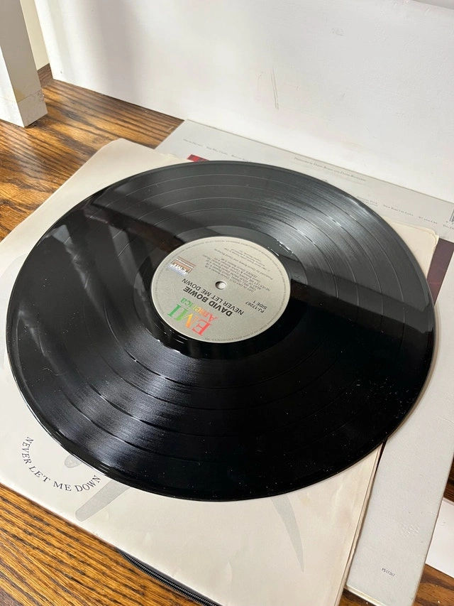 Selling my used David Bowie 'Never Let Me Down' vinyl record, a classic addition to any collection. The record shows signs of wear consistent with its age, but it plays well, offering a nostalgic listening experience. Album cover has some damage (see pics).