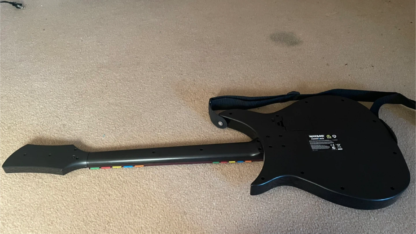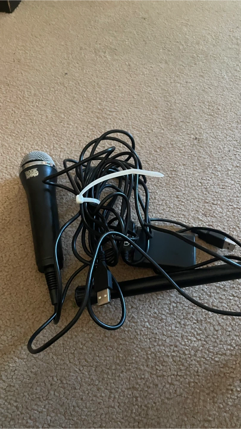 required: A TV with Video and audio component, Nintendo Wii, 2-4 Wii Remote, Two USB-A Dongles (guitar and drums), Batteries, drumsticks (any kind)
