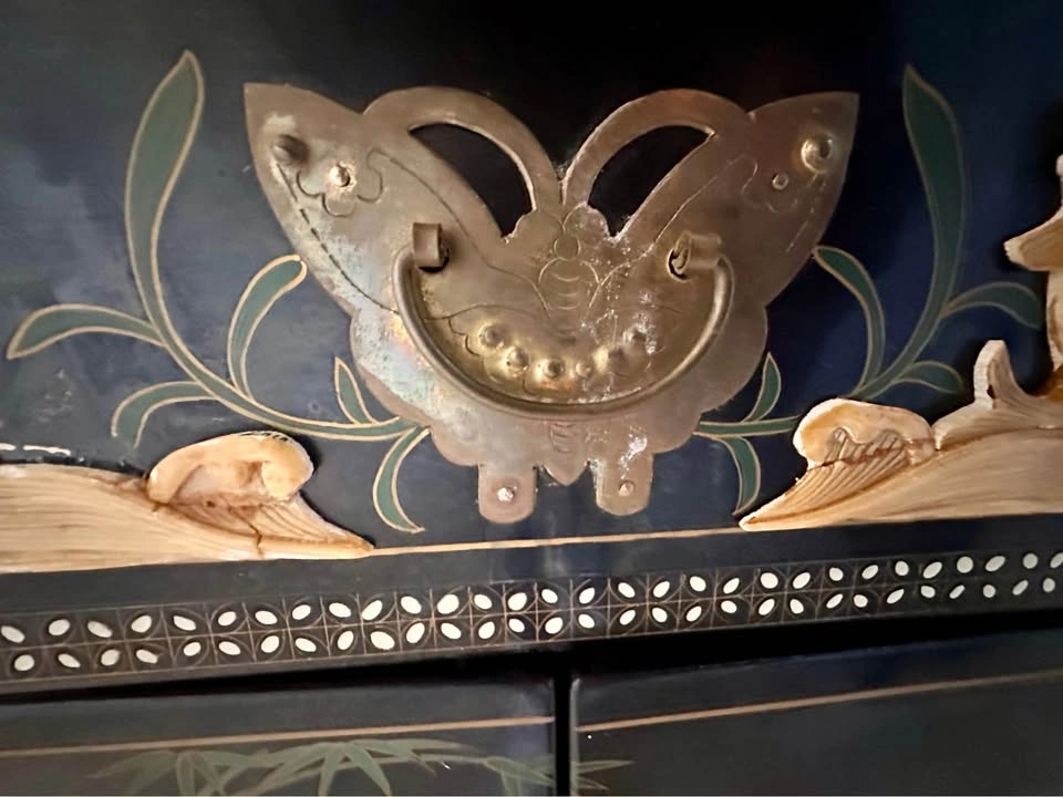 Gorgeous Asian black lacquer alter cabinet with intricate hand-painted and raised soapstone relief scenes. This piece is a true work of art – featuring delicate boats on a lotus pond, koi fish, butterflies, and traditional figures in a serene waterscape. Accented with mother-of-pearl inlay along the edges and brass hardware for an elegant, timeless look.