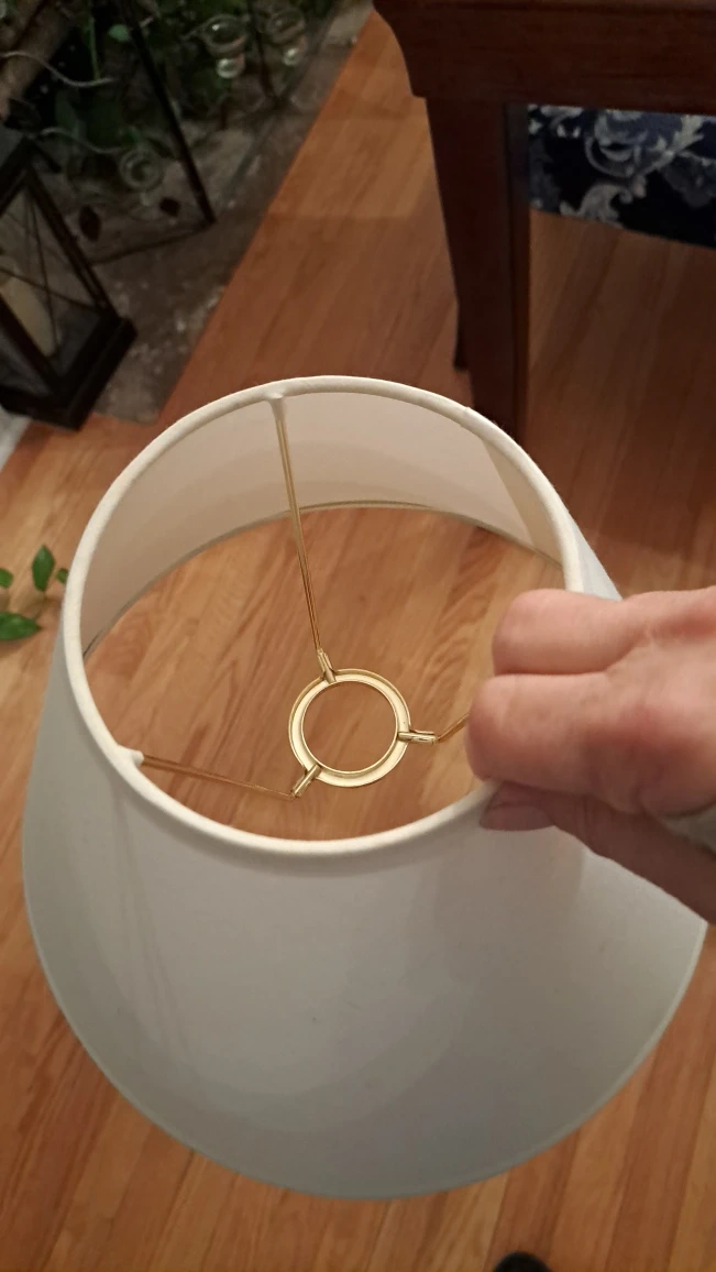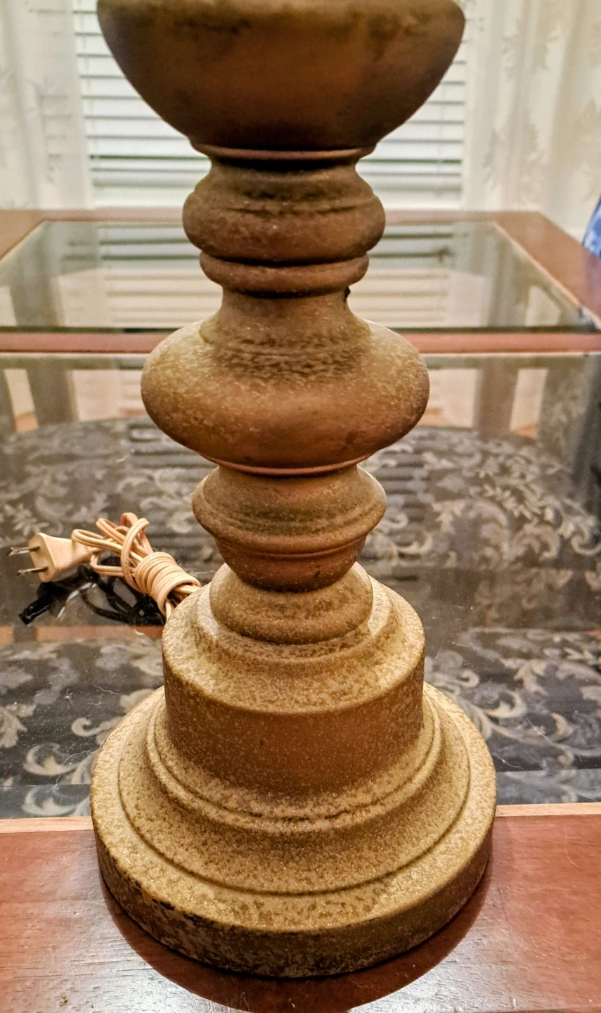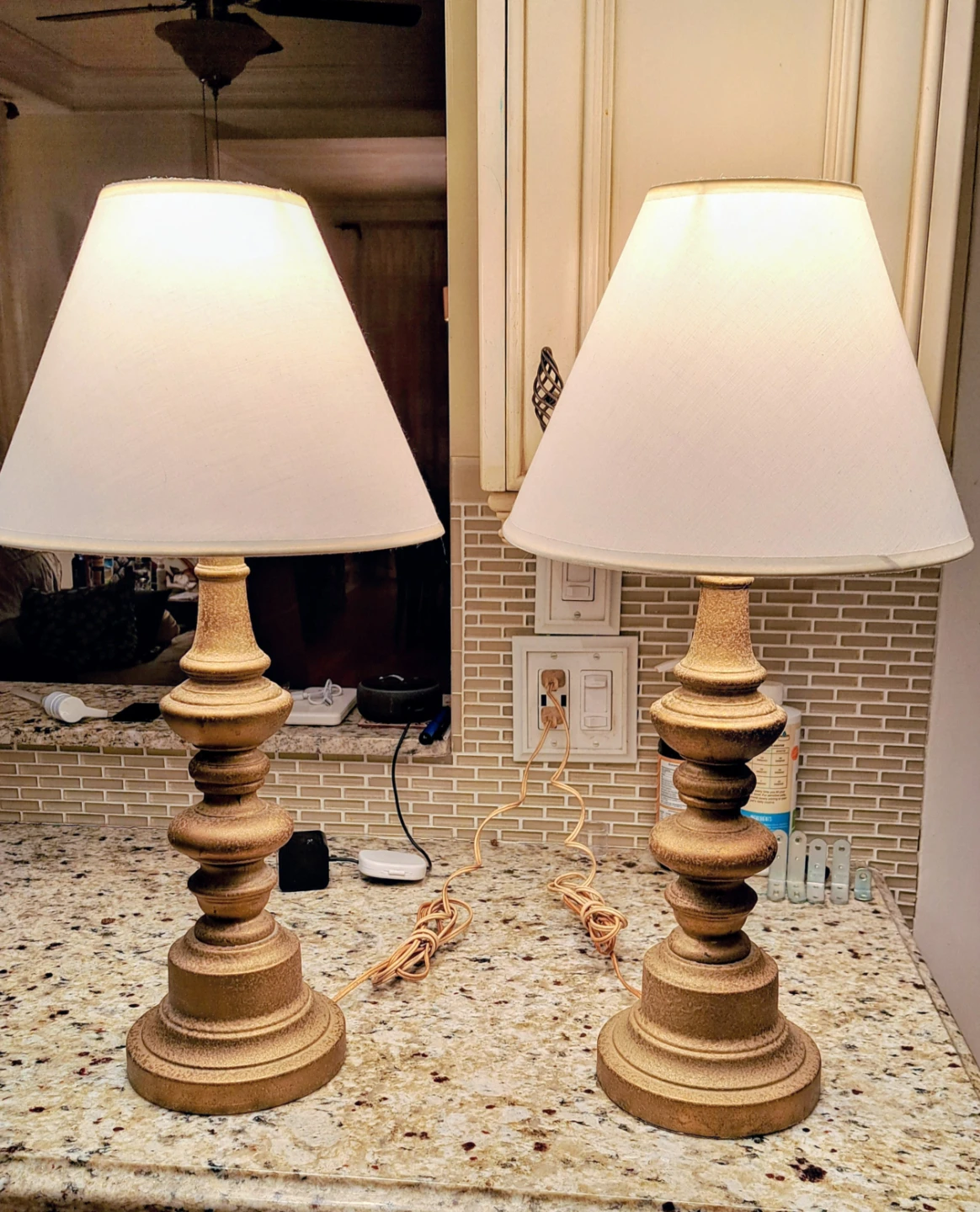 Selling a pair of table lamps with a vintage-inspired design. They feature a unique, ornate base and a classic lampshade. Base was spray painted with a textured antique brass colour.