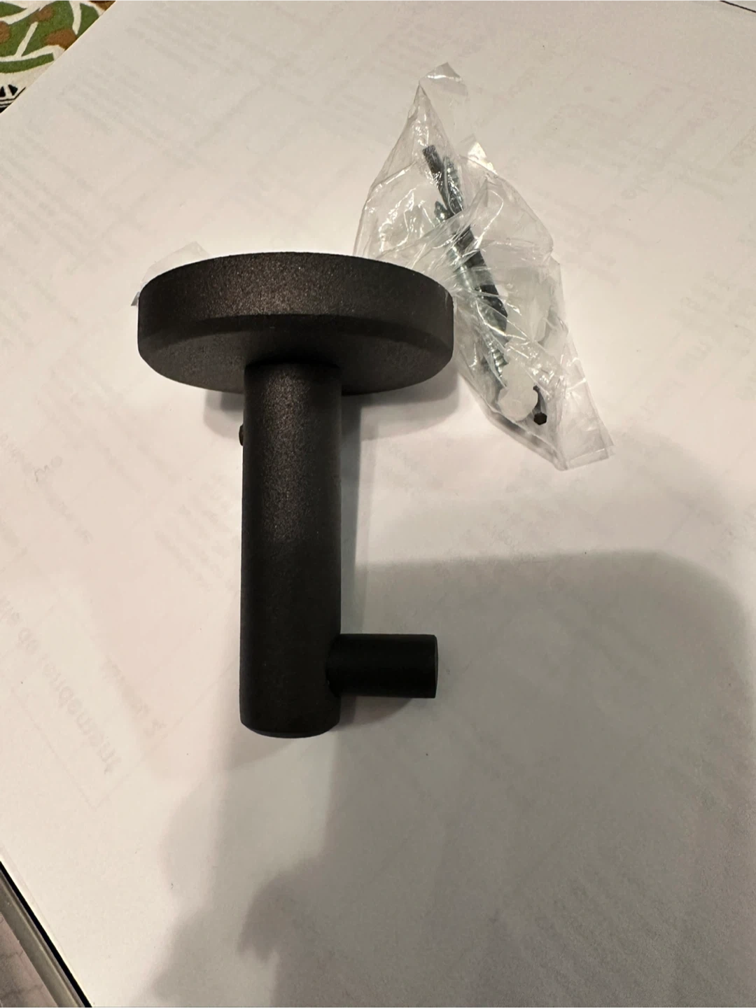 I'm selling a stylish black wall-mounted robe/towel hook. All mounting hardware is included except for the wall part. It's in great new condition and will add a modern touch to any room