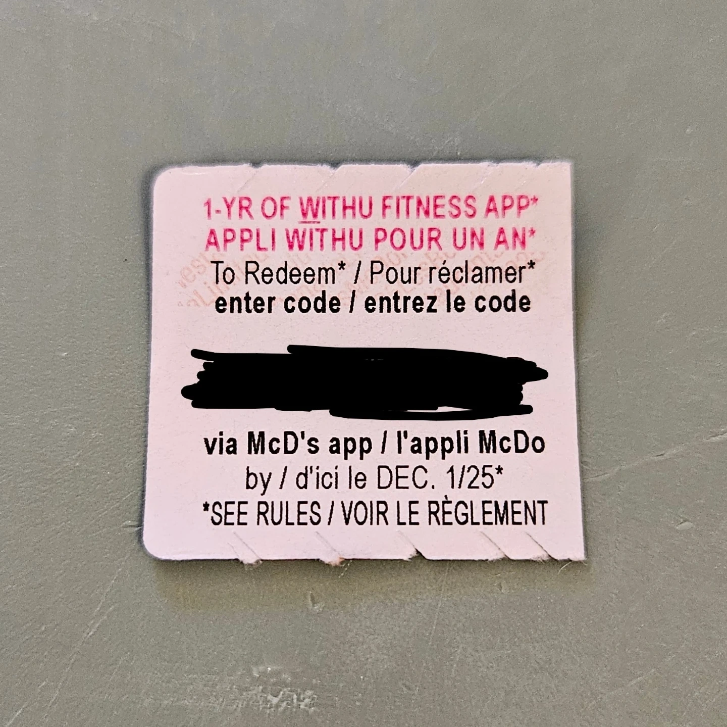 Got this through the McDonald's Monopoly promotion - we know we'll never use it, but maybe you will? You'll need the McD app to redeem it, we haven't scanned/added it.