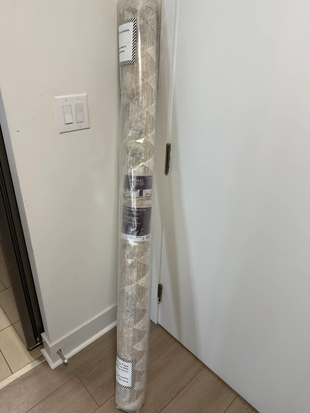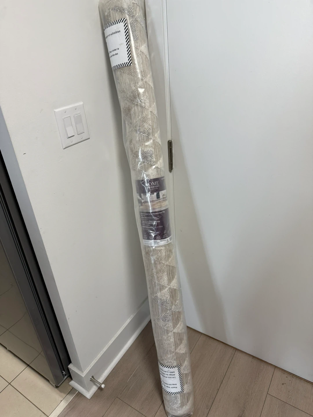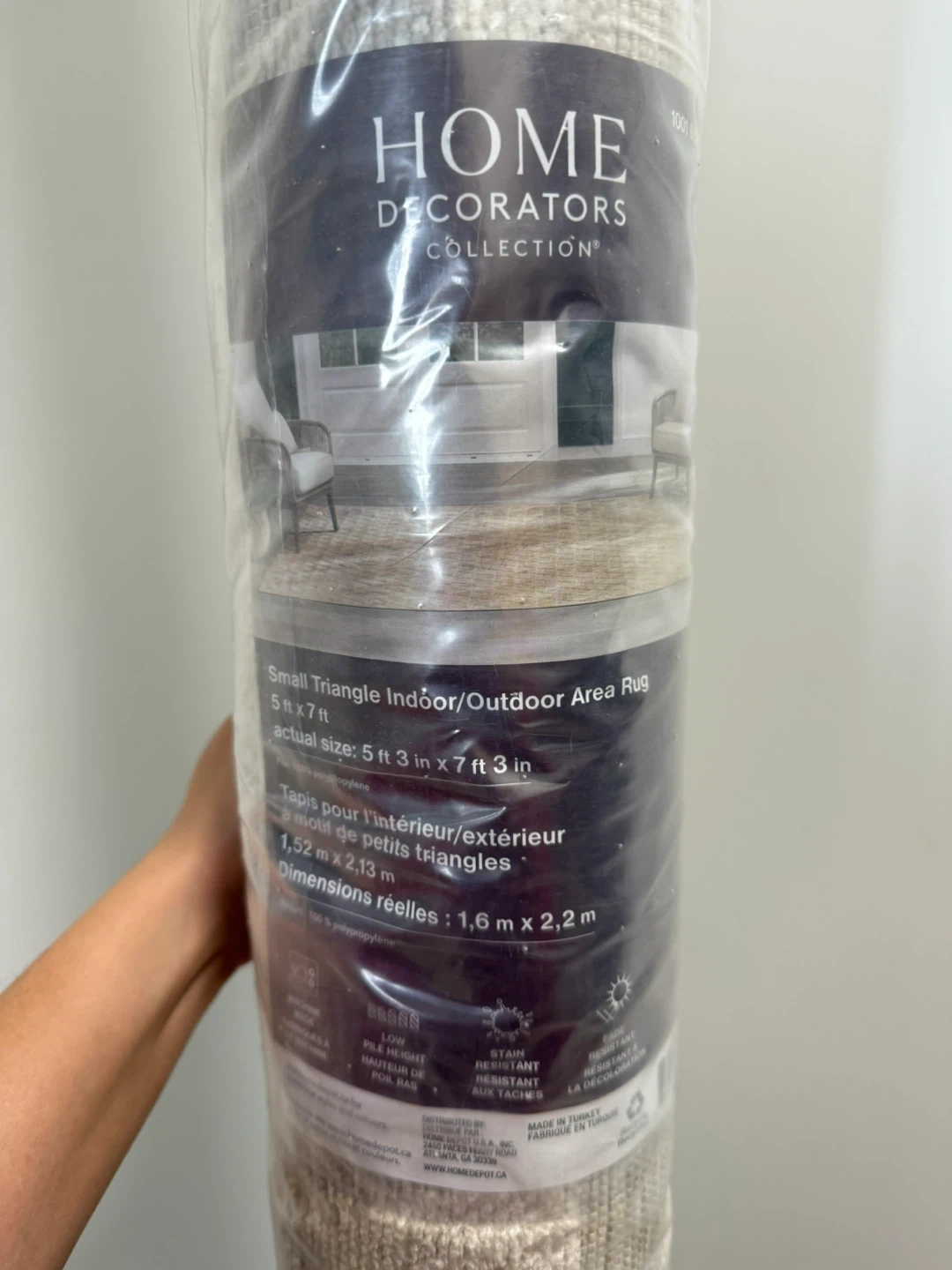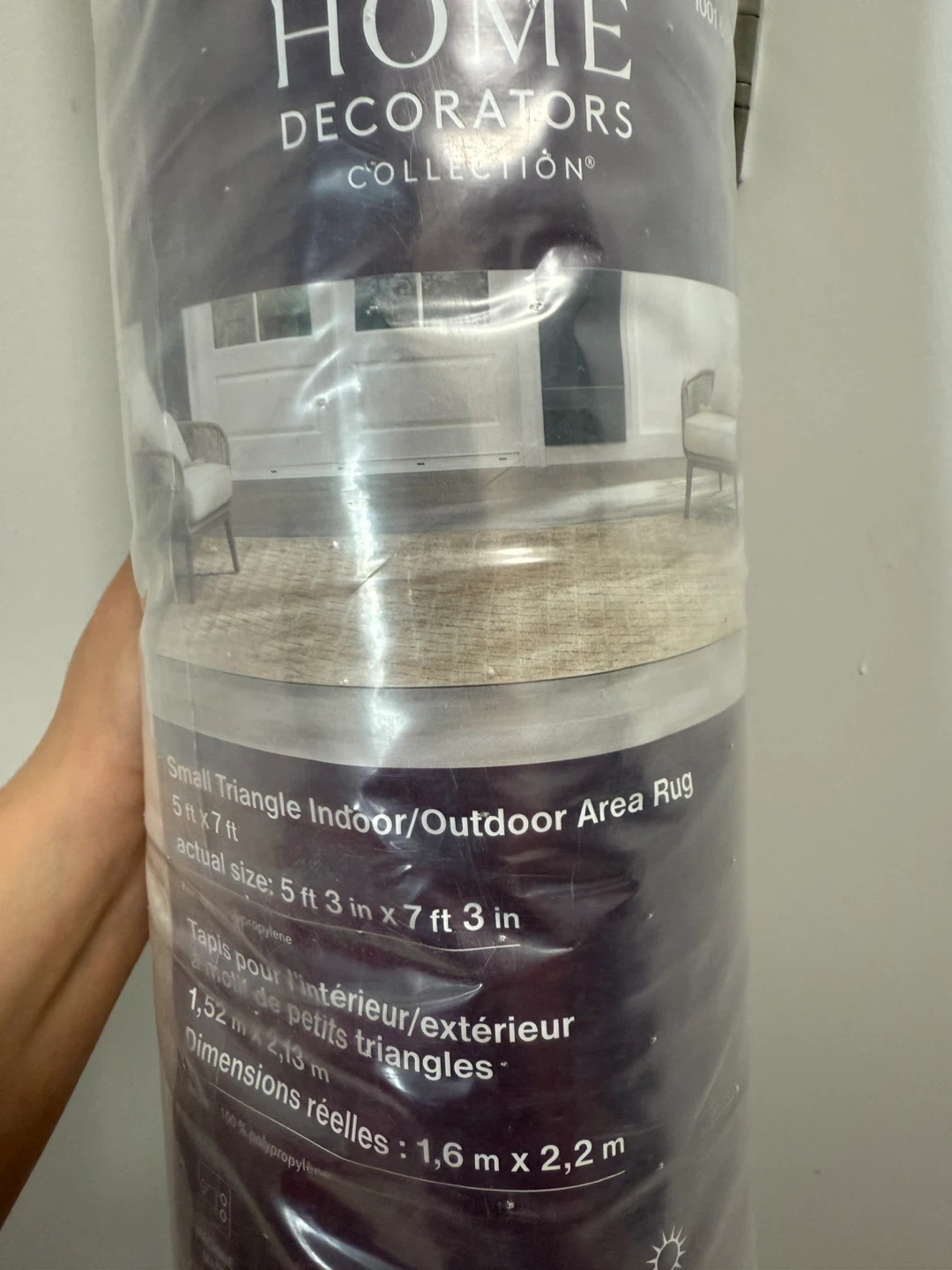 Selling a Home Decorators Collection area rug, perfect for indoor or outdoor use! It features a small triangle pattern and measures 5 ft 3 in x 7 ft 3 in (actual size). The rug is made of 100% polypropylene and is stain-resistant.