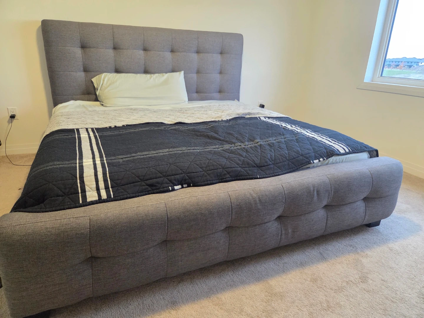 Selling a grey king size bed frame. It's in great condition and would be perfect for any bedroom. The tufted headboard adds a touch of elegance. If you're interested, send me a message! Serious buyers only. I am moving so i do not want the mattress. If you want the king size mattress free with the bed, you are welcome to take it. The mattress does have some stains, but can be used with a mattress protector of you want.