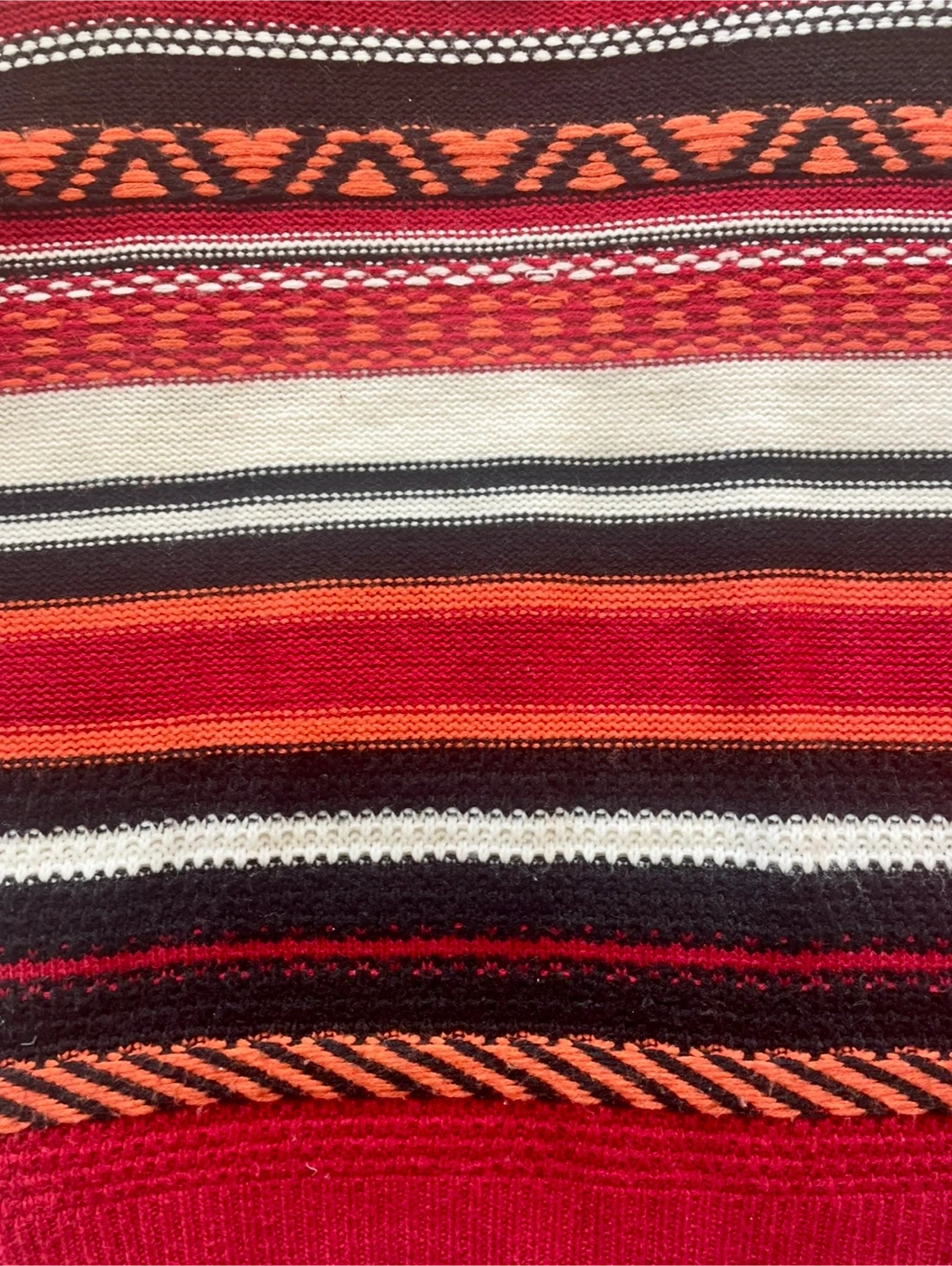 Bold sweater with red, black, white and pink stripes. Features fringe details on sleeves. One of a kind: Stylish and eye-catching. Size Small. In excellent condition.