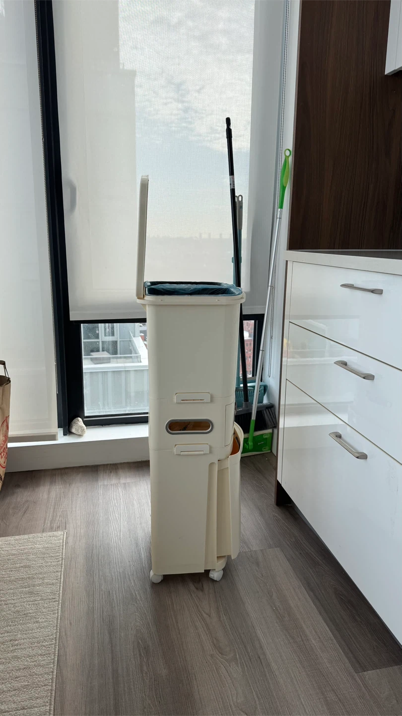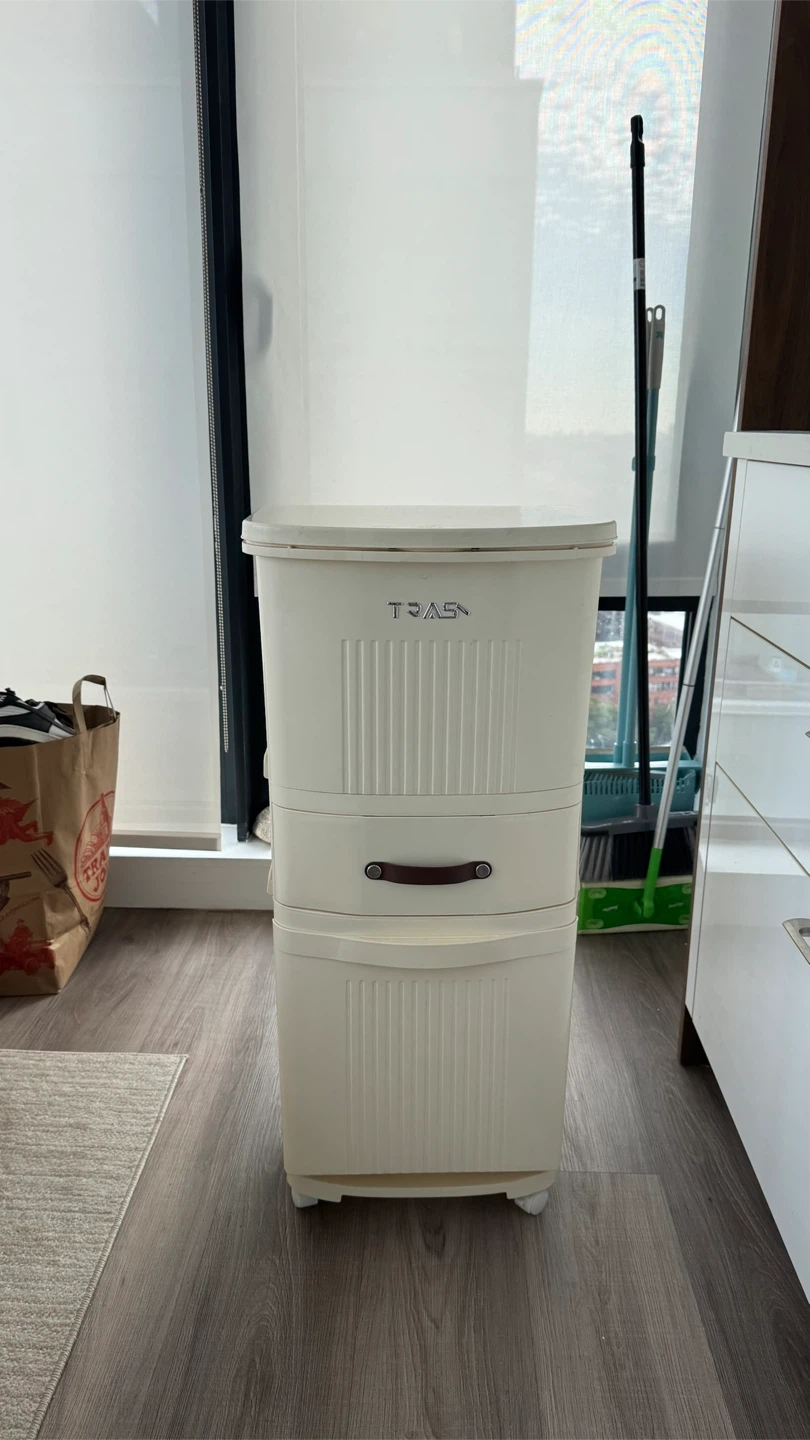 TRAS trash can and storage organizer on wheels. It's in great condition and a super convenient way to keep things tidy and organized in a small space!