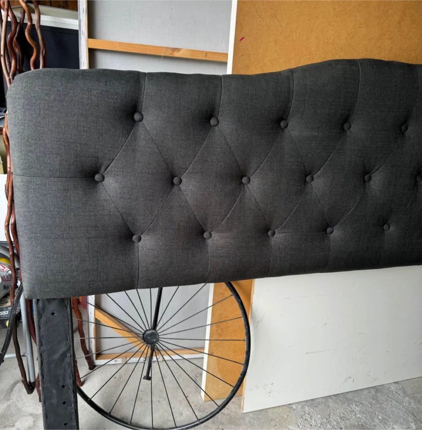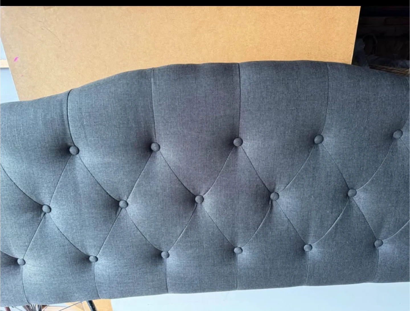Selling a grey upholstered king size headboard! It's in great shape and would look lovely in any bedroom. The button-tufted design adds a touch of elegance and comfort to your space. It's ready for a new home!