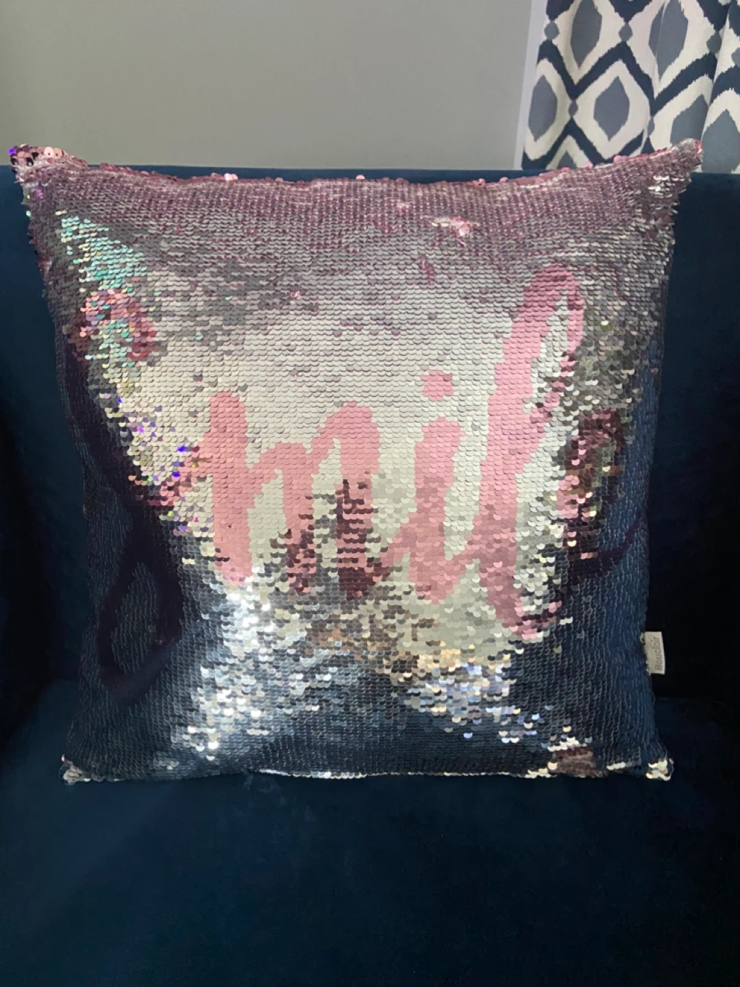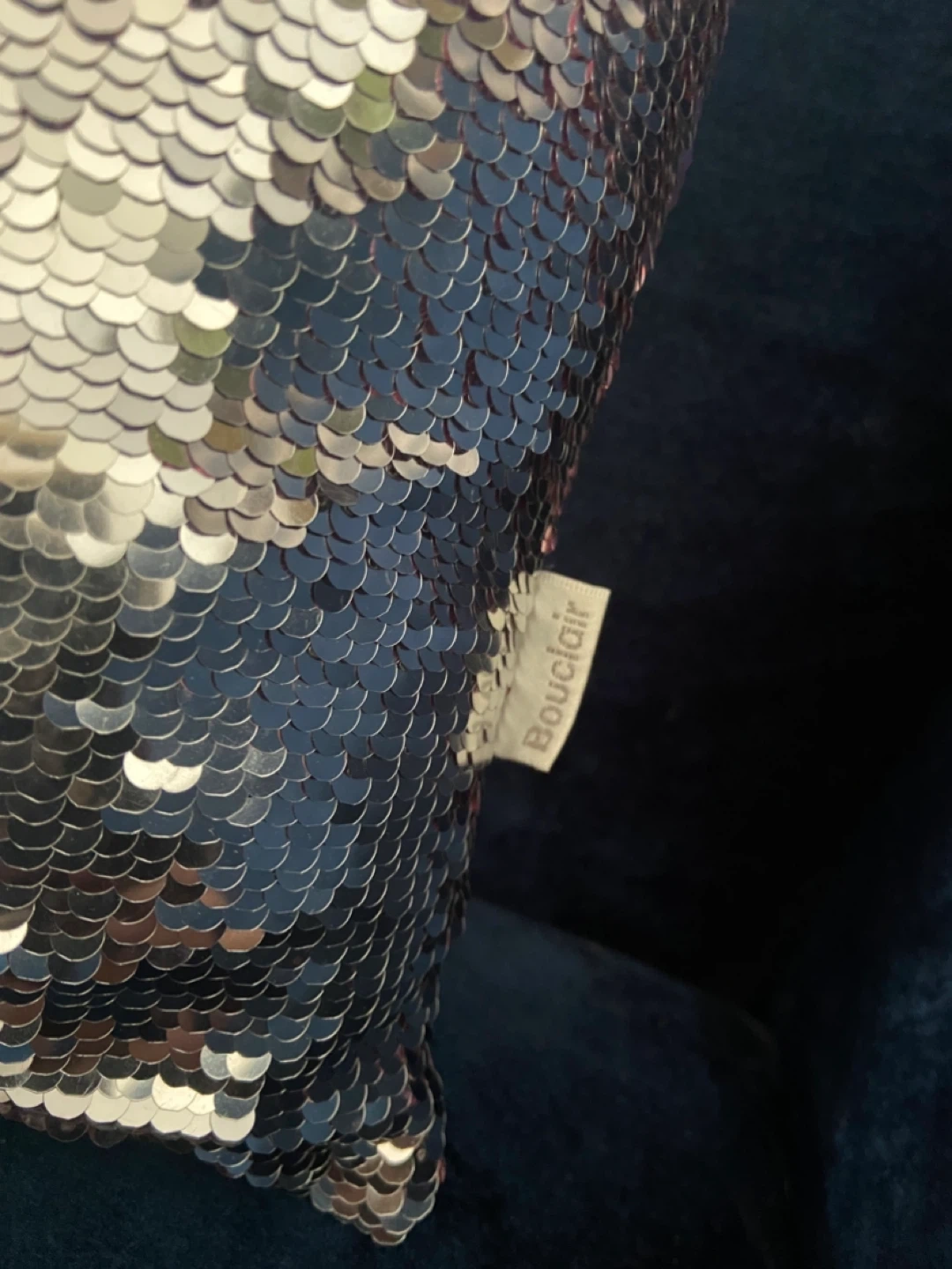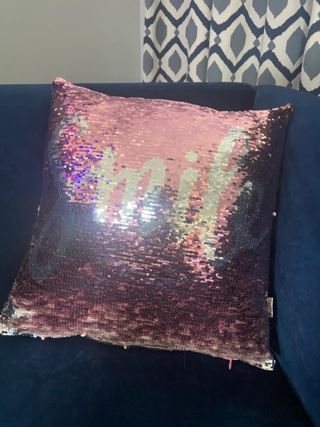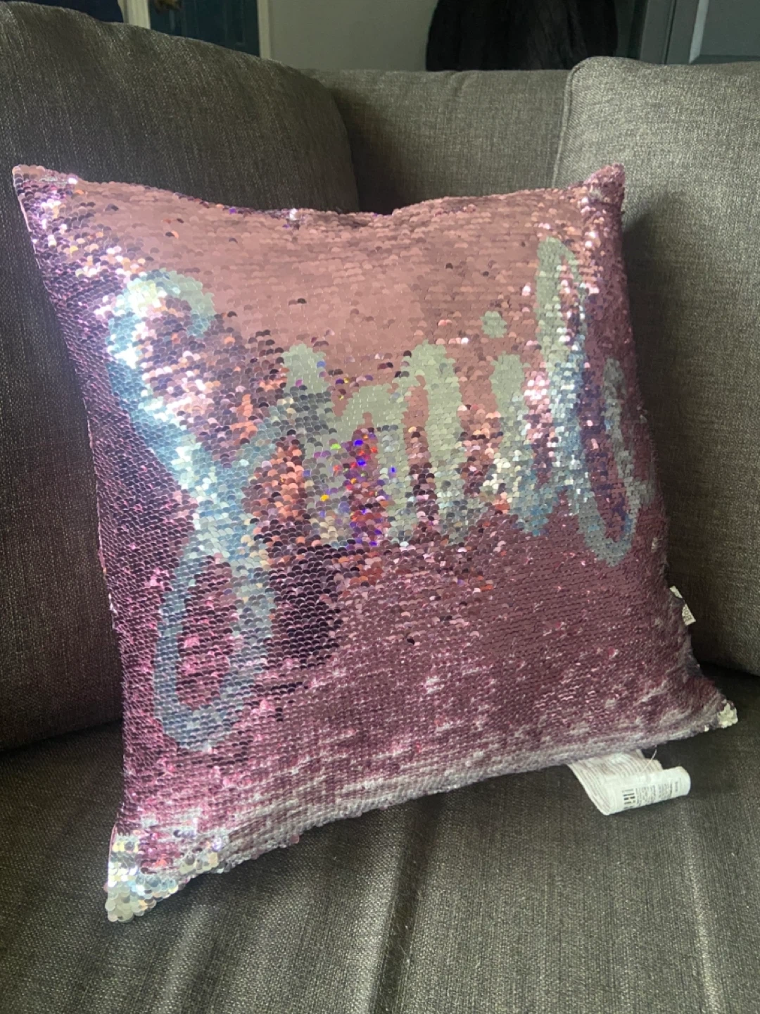 Add a touch of sparkle to your space with this Bouclair flip sequin pillow! One side is a lovely pink, and the other is a shimmering silver. It's in great condition and ready to brighten up your home. Smk-free home