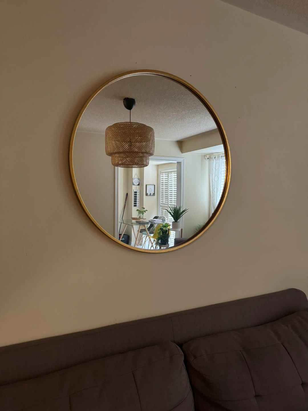 Selling a round mirror with a gold frame. It's in great shape and would look lovely in any room. The mirror reflects light beautifully, making the space feel brighter and more open