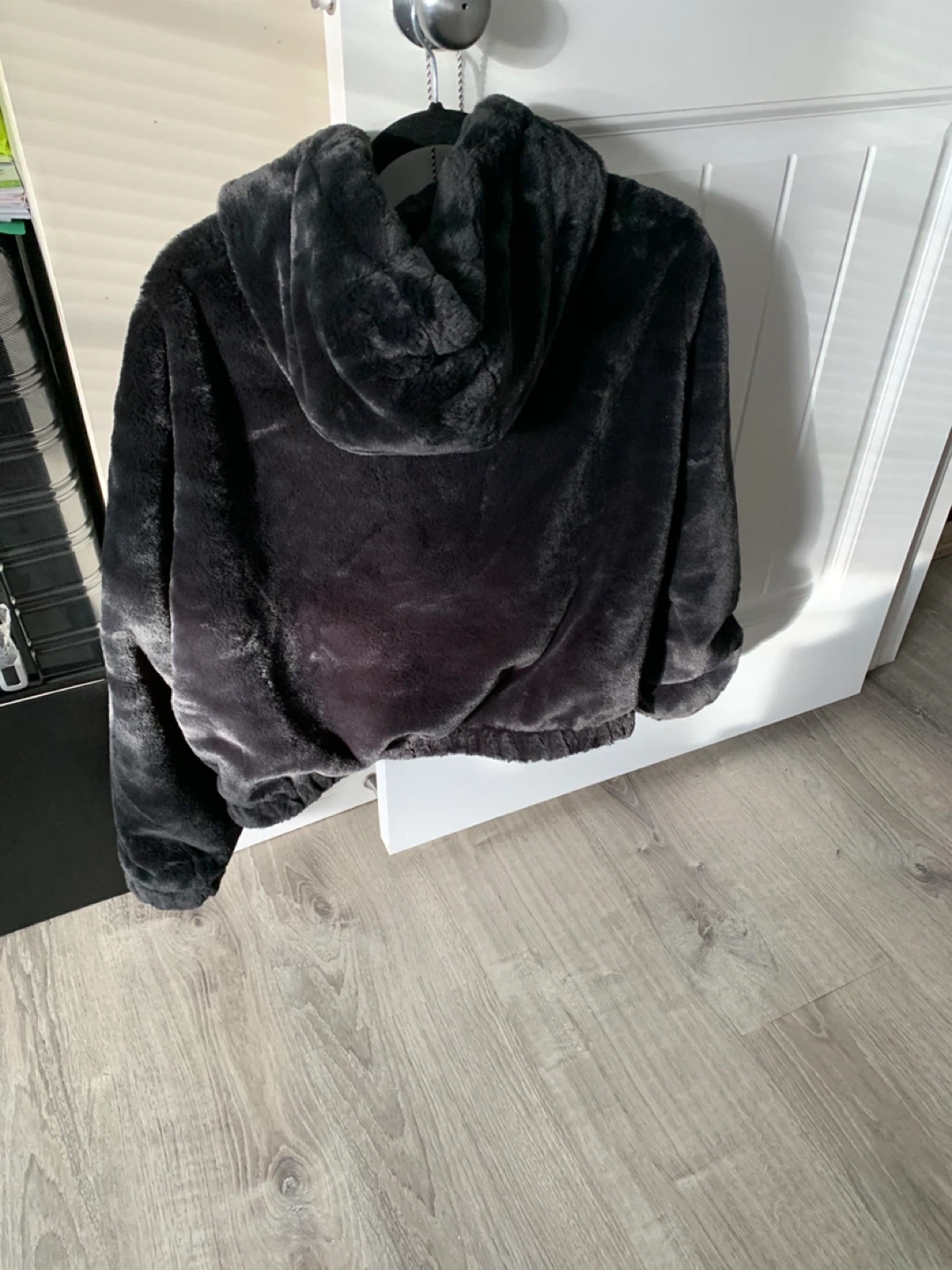 Here's a faux fur black hooded jacket! It's perfect for adding a bit of warmth and style to your outfit. The material is soft and comfortable, making it great for everyday wear. Makes a great Christmas gift as well!