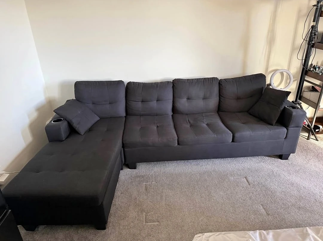 Selling a comfy dark grey sectional sofa! It features a chaise lounge on one end and includes cup holders for your convenience. Perfect for a living room or entertainment space. There are some signs of use.
