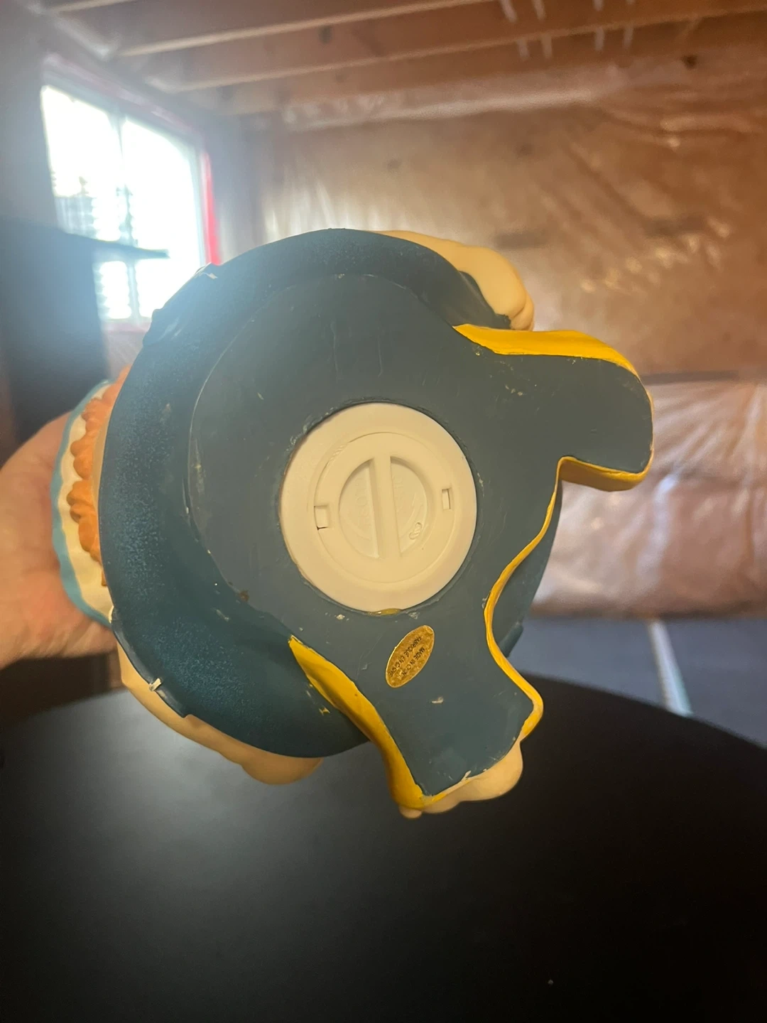 It’s in great shape and ready to help you save up for your next getaway! It has a slot on the top of the head to insert your coins and a removable plug on the bottom.