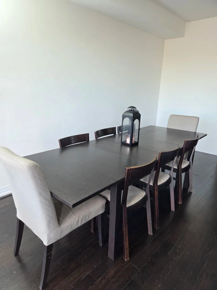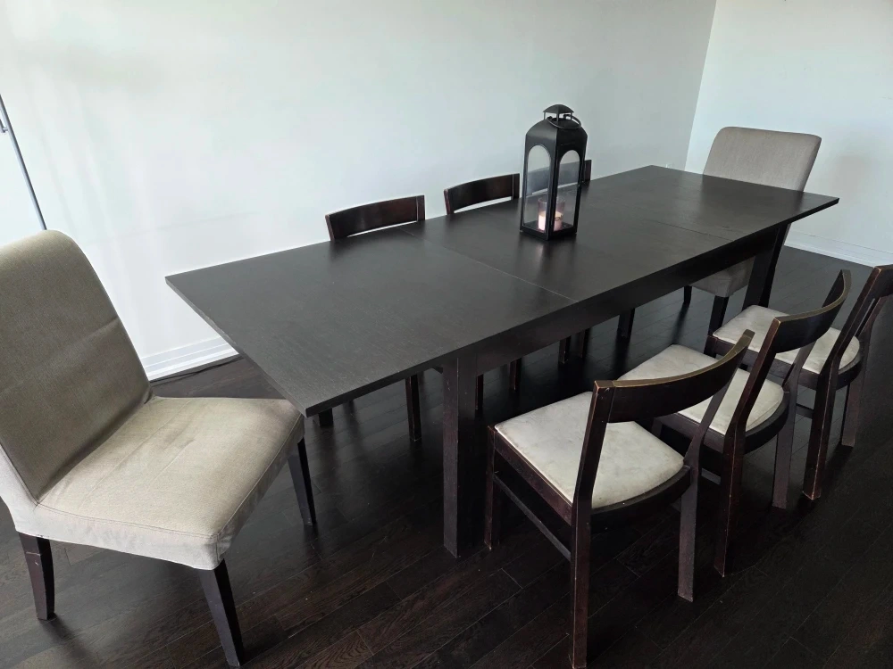 Selling a dining table with 8 chairs. The set is a dark wood colour and would look great in any dining room. It can convert into a 4, 6 or 8 seater. It has 6 identical chairs with 2 master chairs. It's in good condition and ready for a new home!