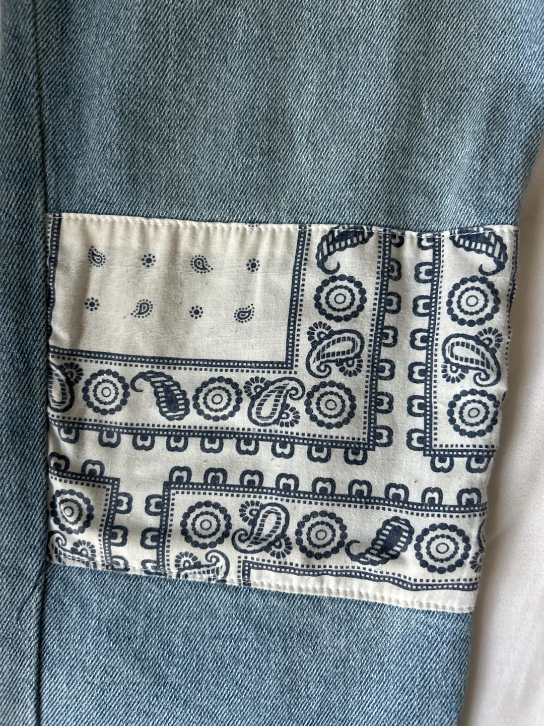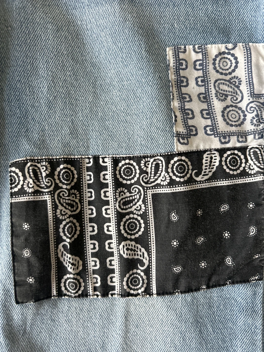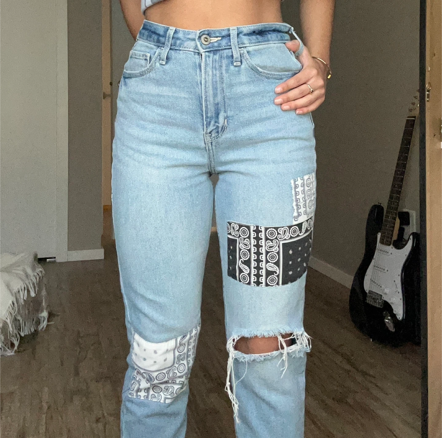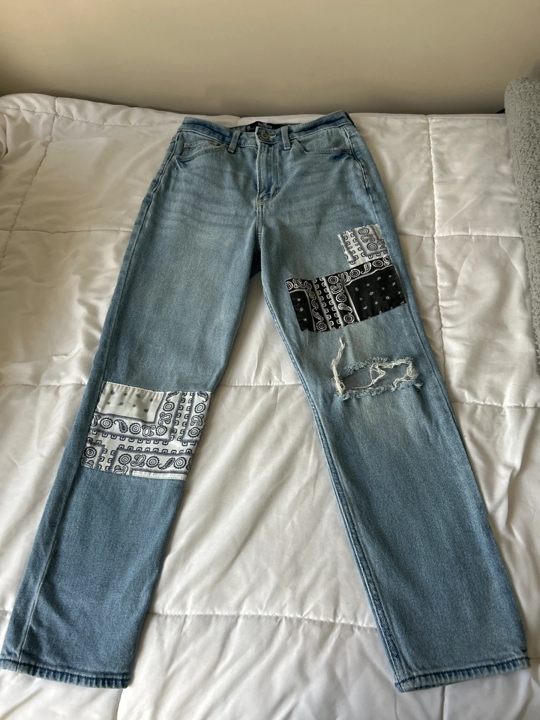 Selling a pair of Hollister Ultra High-Rise Mom Jeans in size 0S (W24/L25). These jeans feature a light wash denim with unique bandana-print patches. They are in great condition and ready for a new home!
