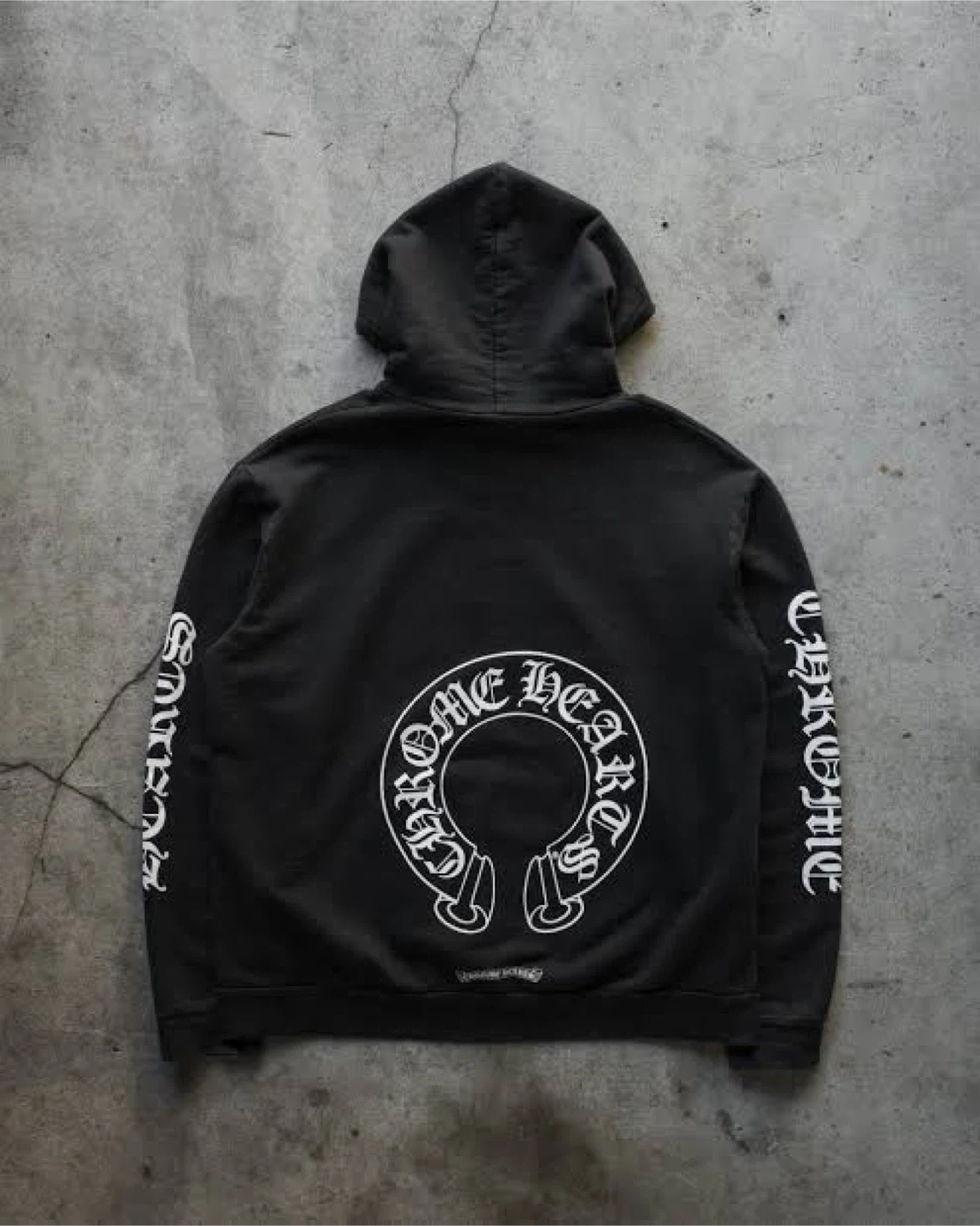 Selling a Chrome Hearts black zip-up hoodie. It features the iconic Chrome Hearts logo on the back and sleeves. This hoodie is made with high-quality materials and exquisite design, perfect for adding a touch of punk hip hop style to your wardrobe