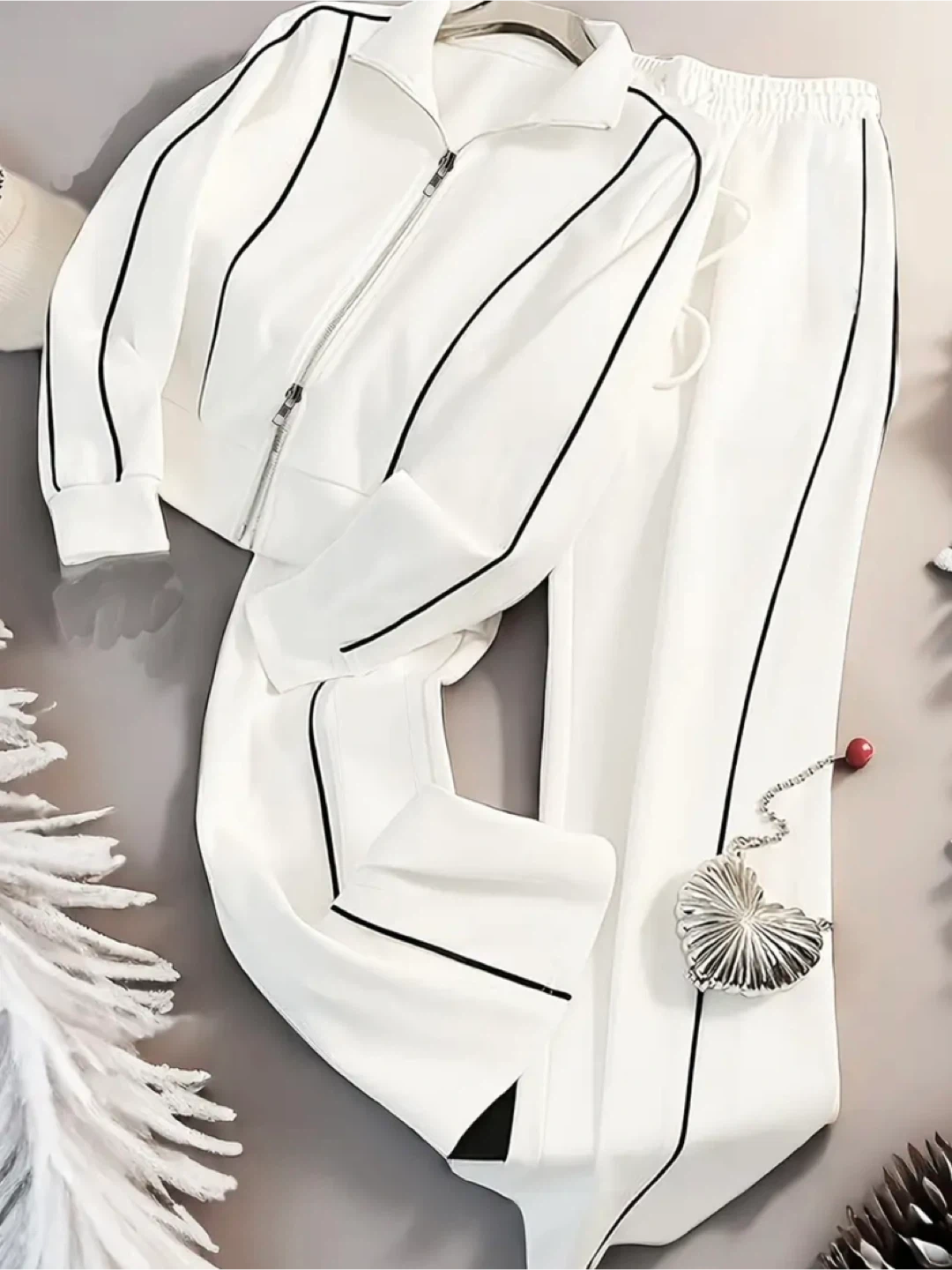 Selling a stylish white tracksuit with black stripes! The set includes a zip-up jacket and drawstring pants. Perfect for a sporty or casual look