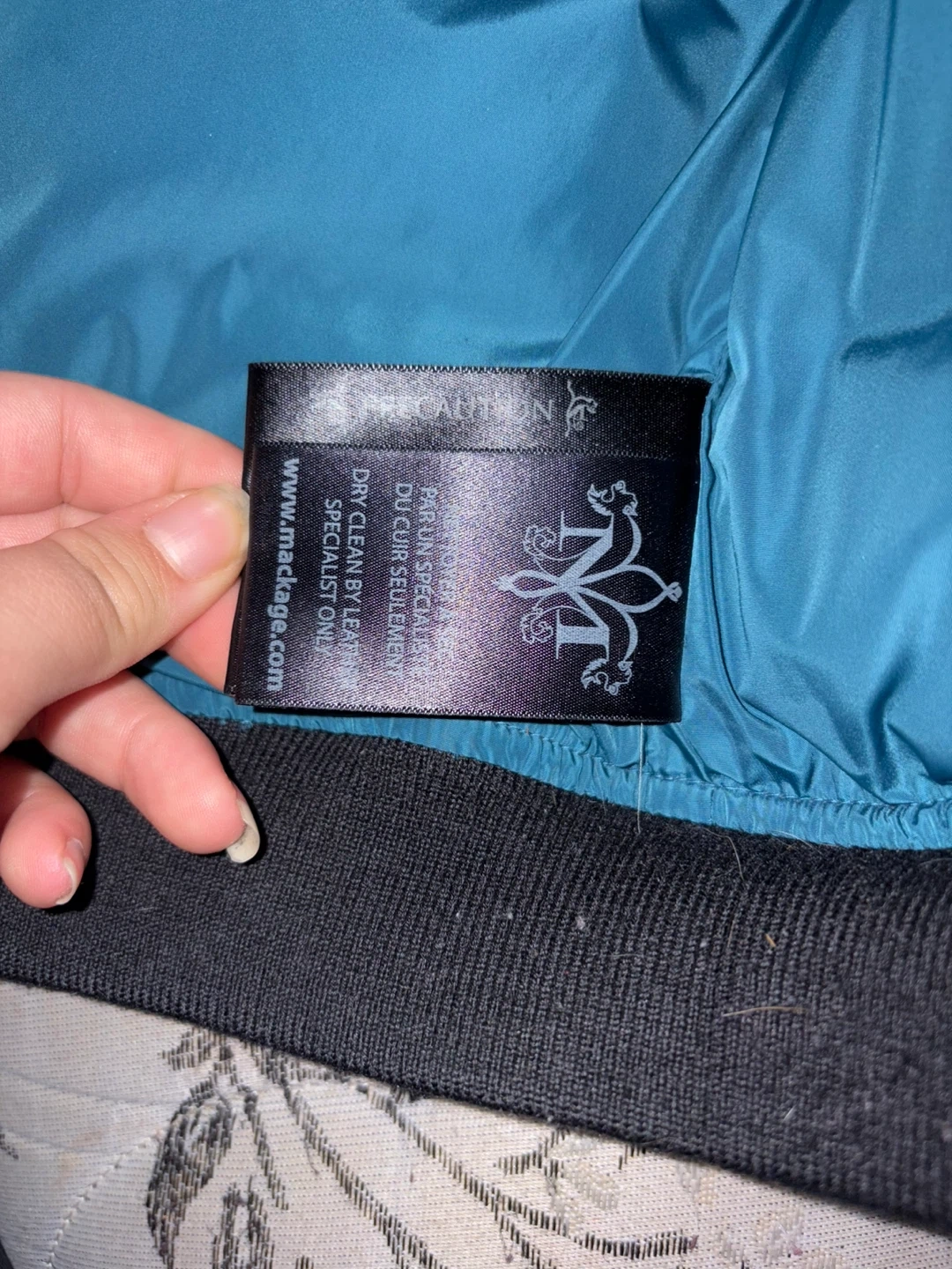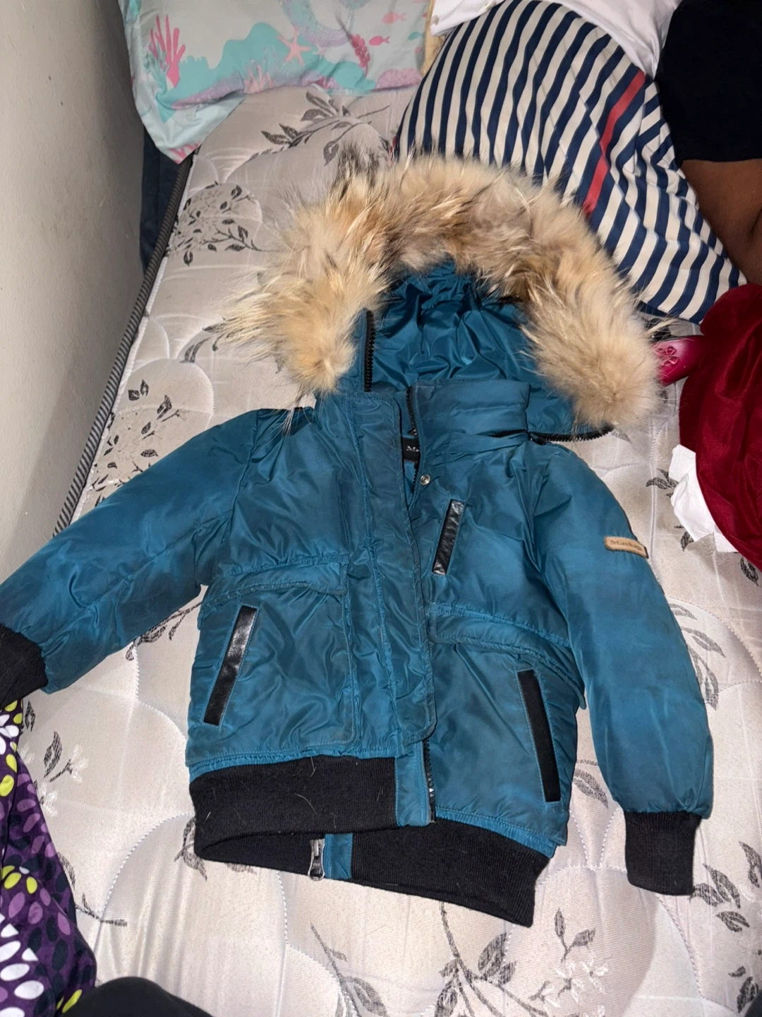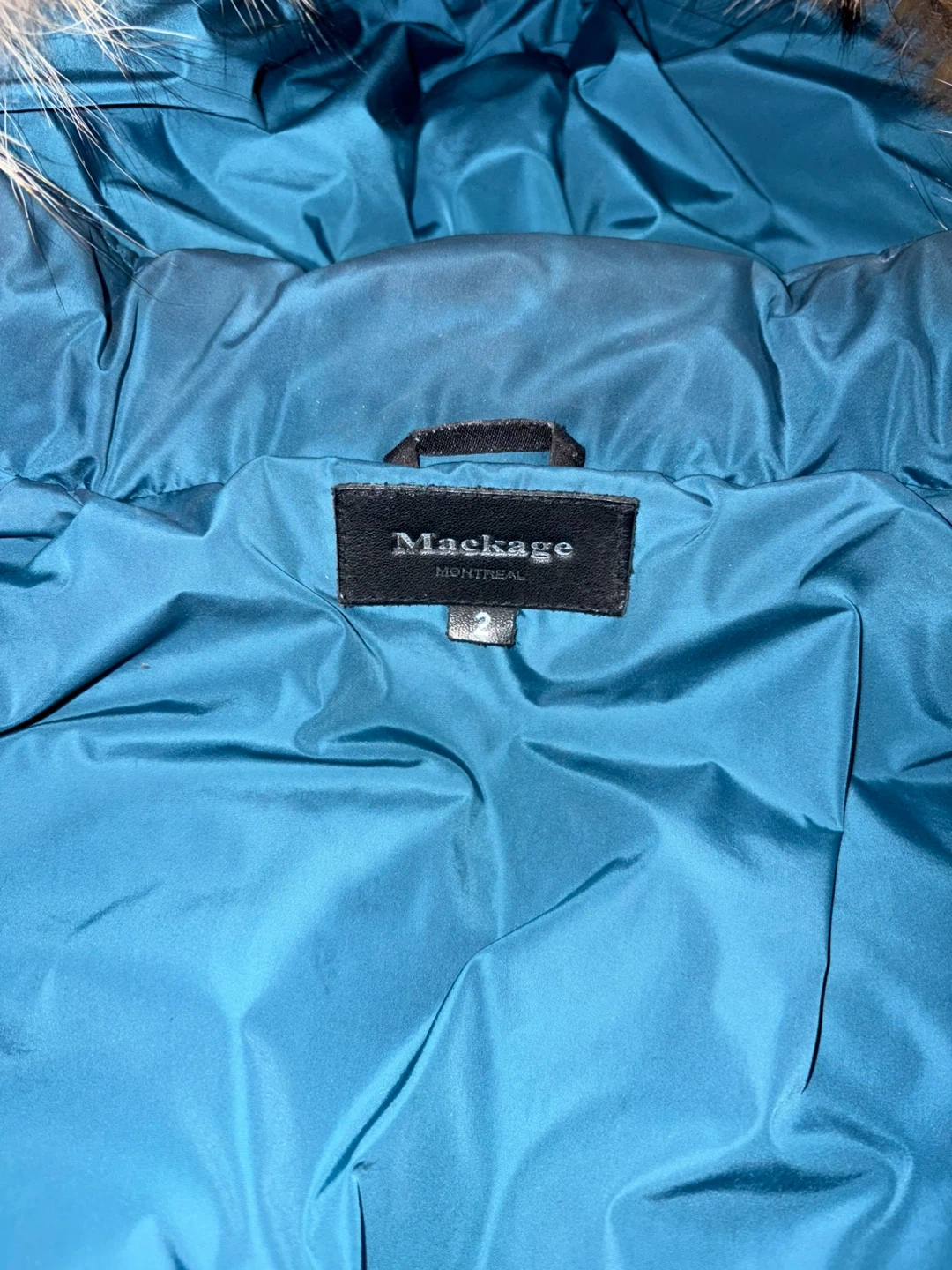 Mackage winter jacket in a lovely teal colour. It's a size 2, perfect for keeping warm during those cold Canadian winters! There are some signs of wear, but it's still in good condition and ready for a new home
