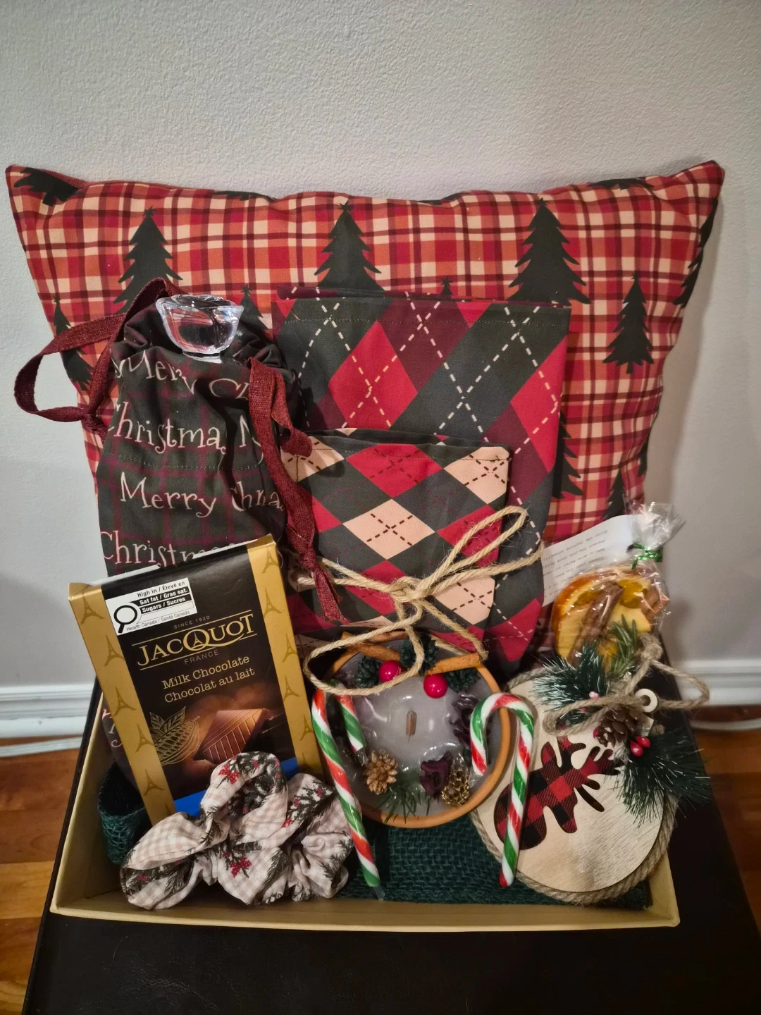 Looking for the perfect holiday gift? My Christmas baskets include: Cozy Christmas pillow ◦ Handmade candle Holiday gift bag, Bubble bath, scrunchie, Tea towel + dishcloth, simmering potpourri, Chocolate treat Christmas, tree ornament