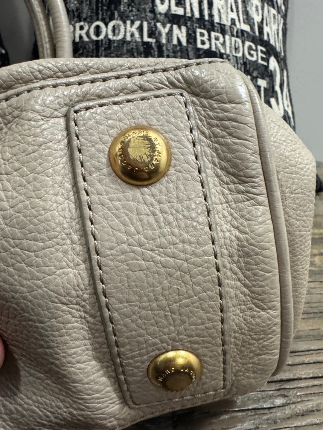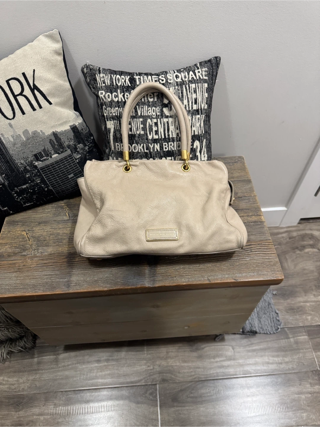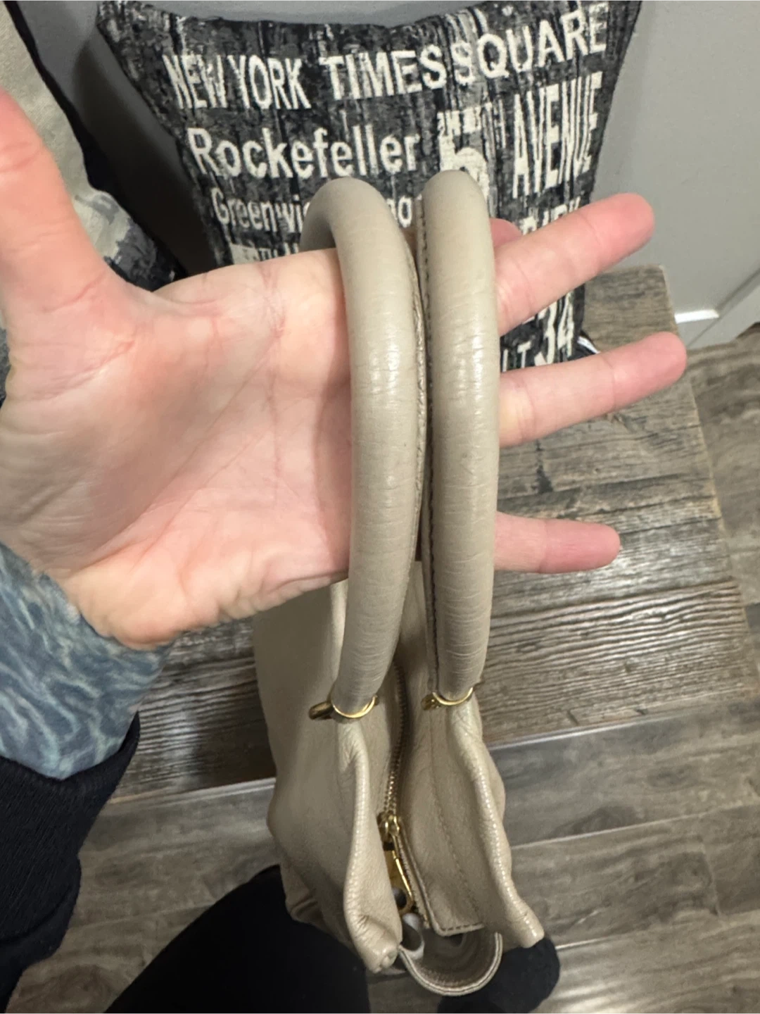 357Thick taupe- cream leather handbag is perfect for any occasion. Scuffs to gold hardware, some marks to interior bag & outer leather. Outer aspect great condition. No dustbag or tags Tall 10” tall but bag 8” inside Length 15” Wide 5” Strap drop 7” Pu only