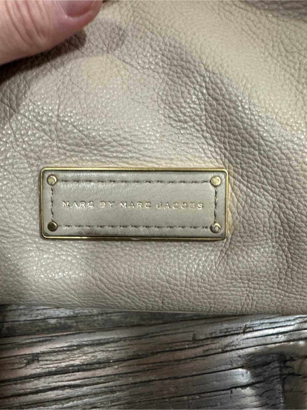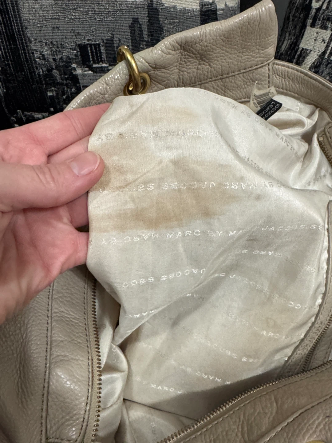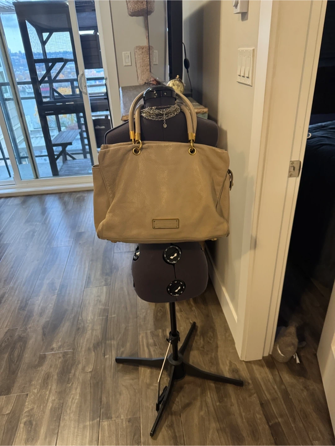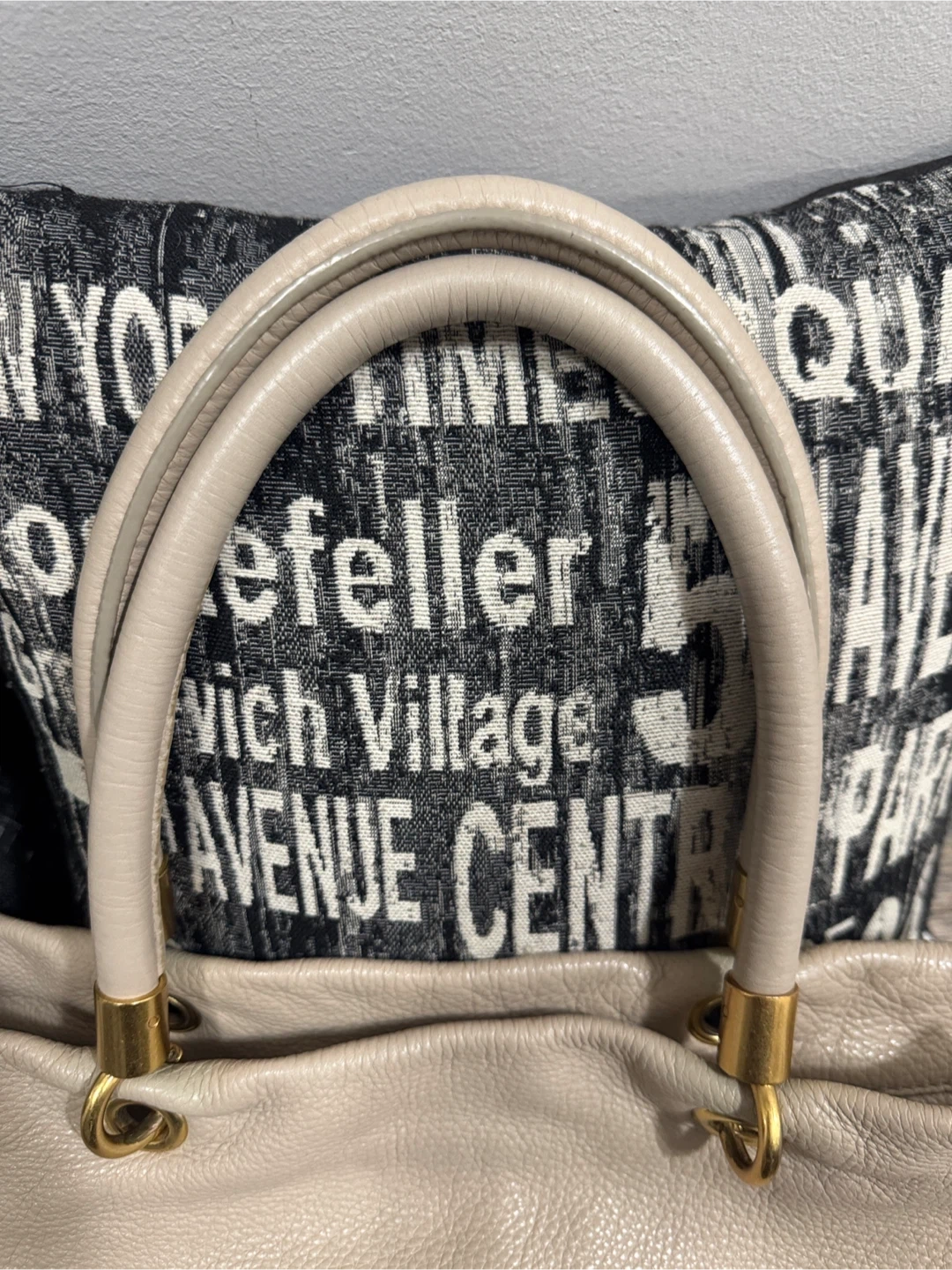 357Thick taupe- cream leather handbag is perfect for any occasion. Scuffs to gold hardware, some marks to interior bag & outer leather. Outer aspect great condition. No dustbag or tags Tall 10” tall but bag 8” inside Length 15” Wide 5” Strap drop 7” Pu only