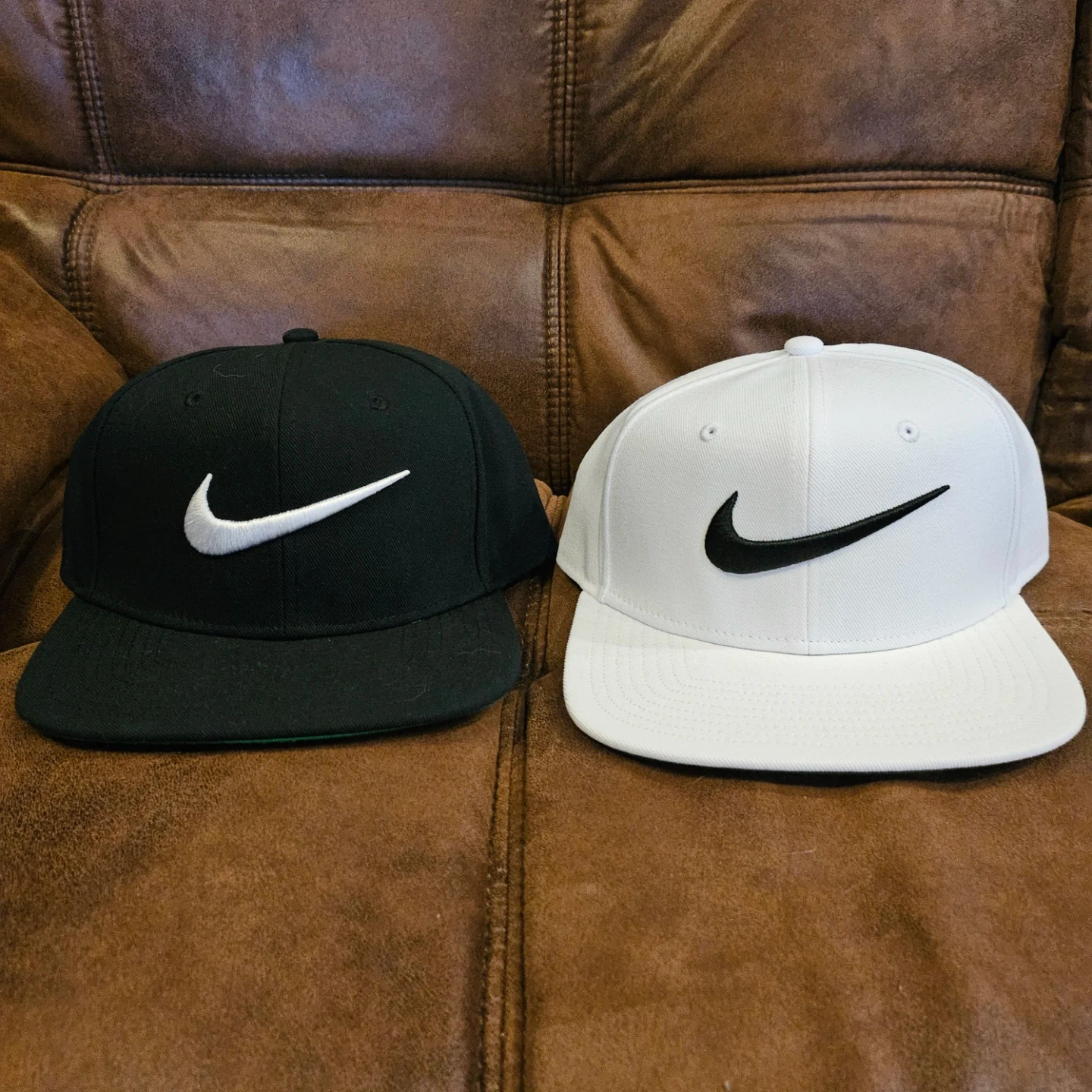 Selling two Nike flat brim caps! One is black with a white logo, and the other is white with a black logo. They're in great condition and ready for a new home!