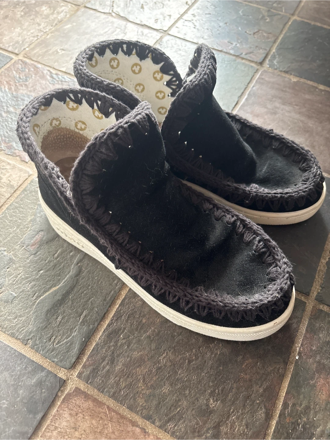Selling a pair of Mou Eskimo sneakers in black, size 39. They're in great condition and ready for a new home! These sneakers feature a unique crochet trim and the Mou logo on the back. Perfect for adding a touch of style to your casual outfits