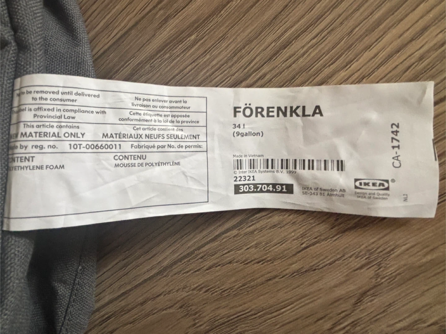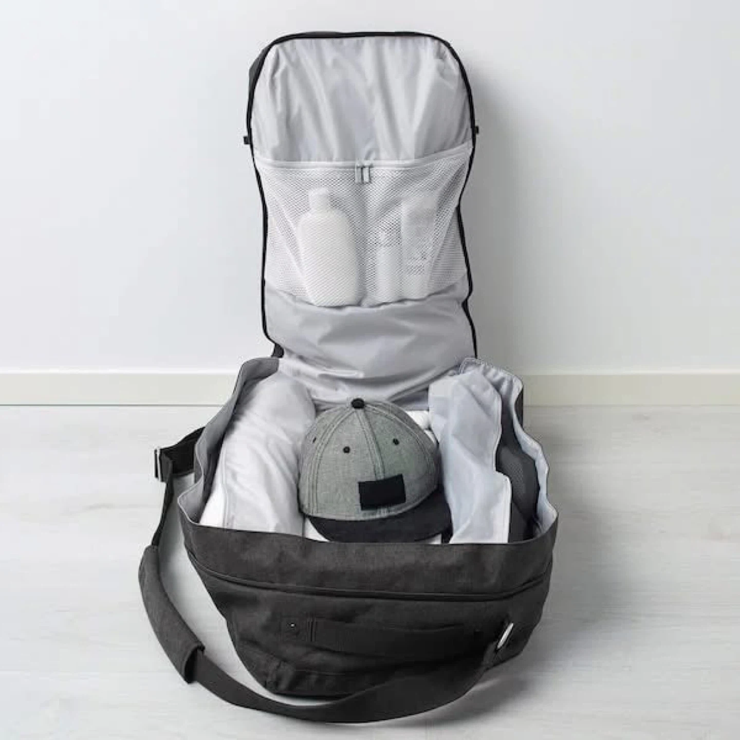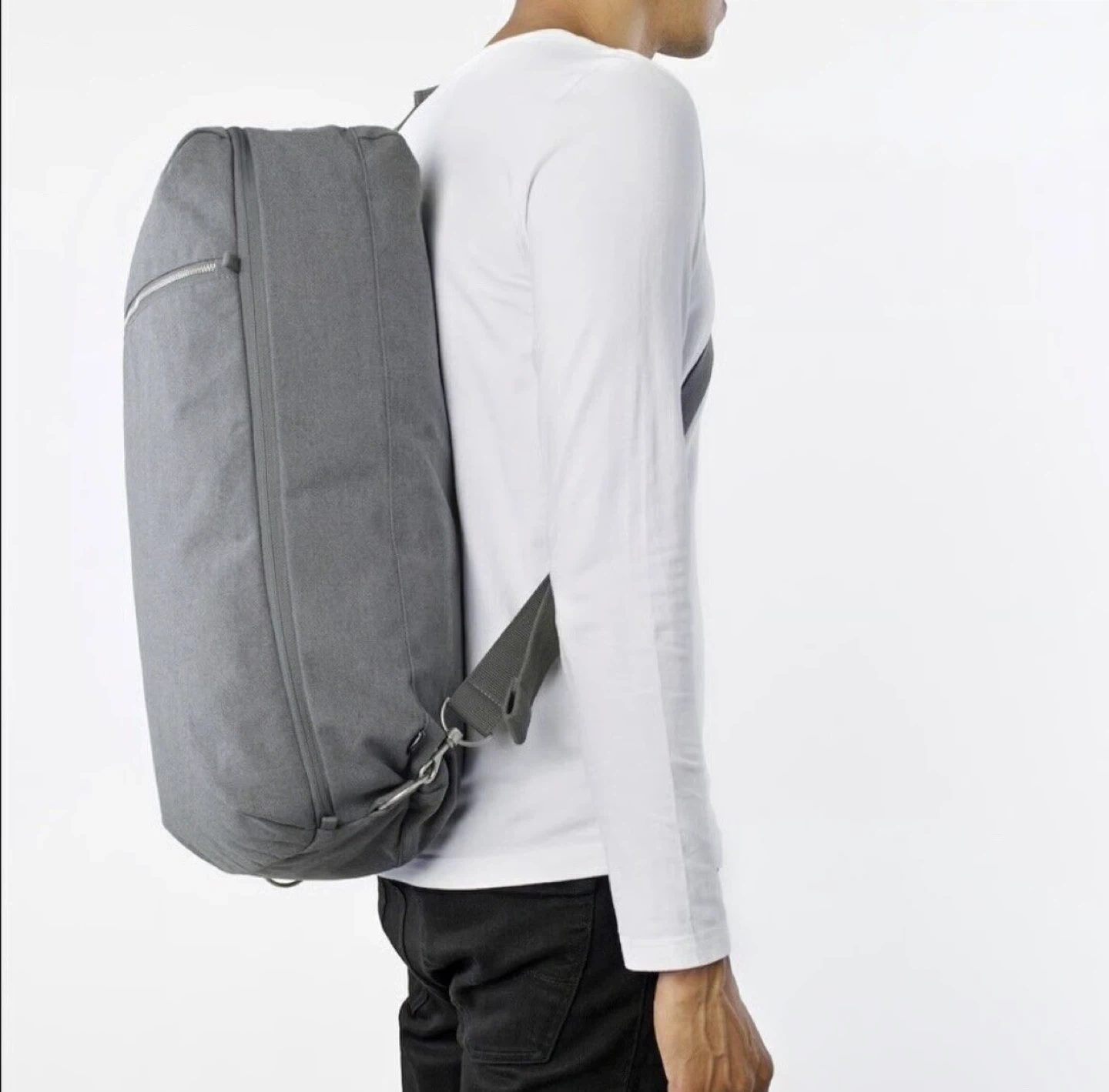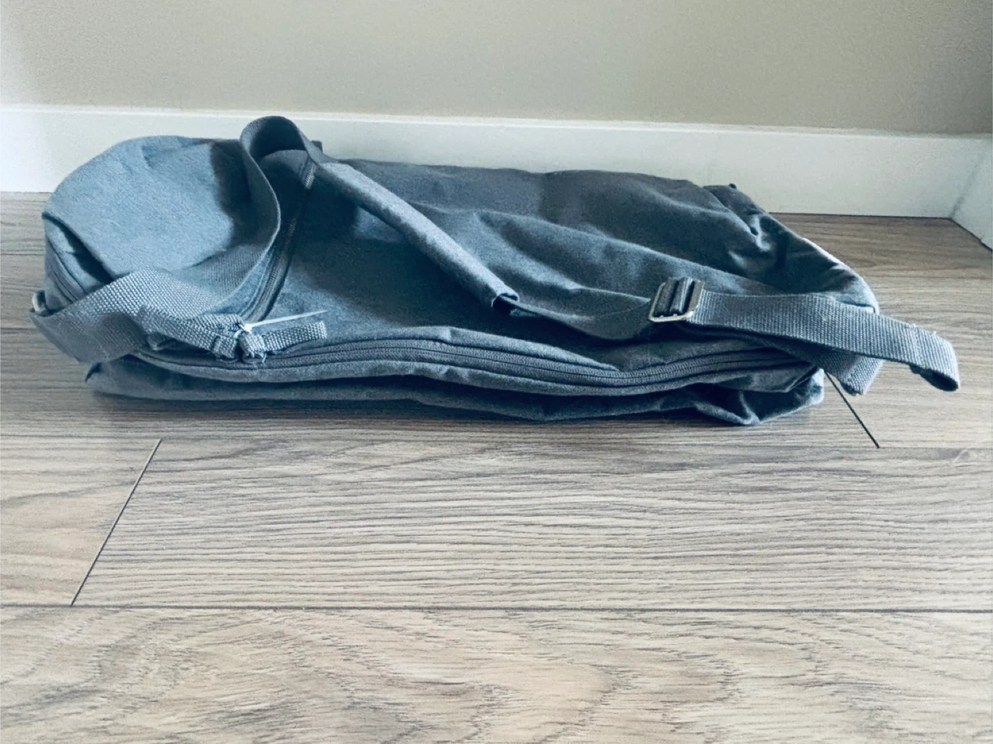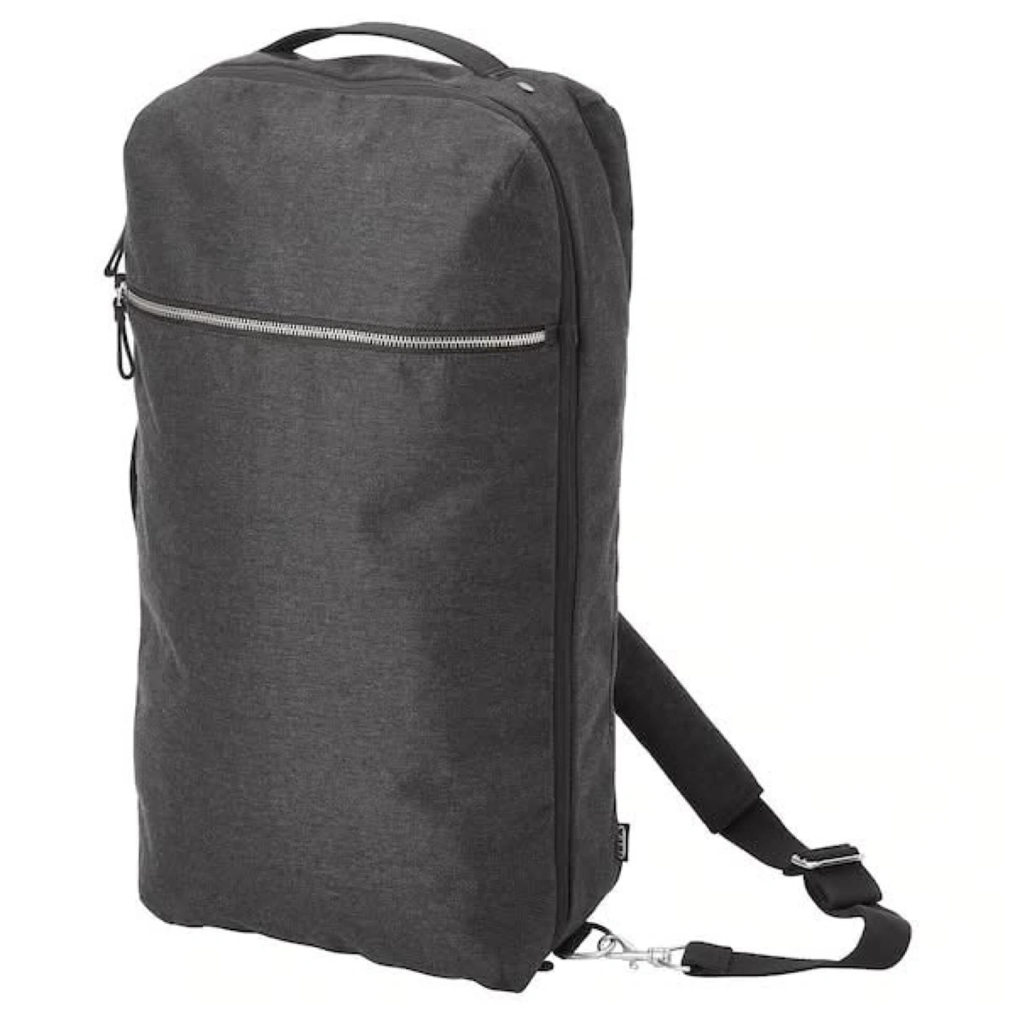 Zip closure, two inner pockets, strap allows for it to be used as a messenger bag or backpack. Brand new, zippers still sealed shut, never used.